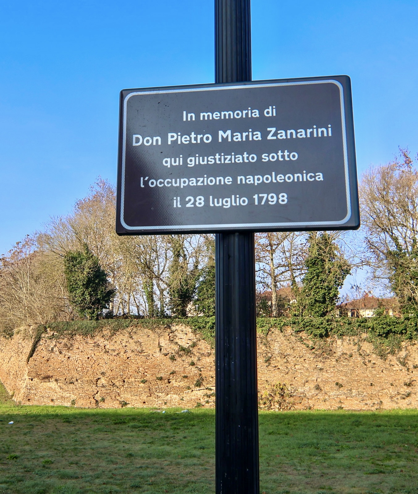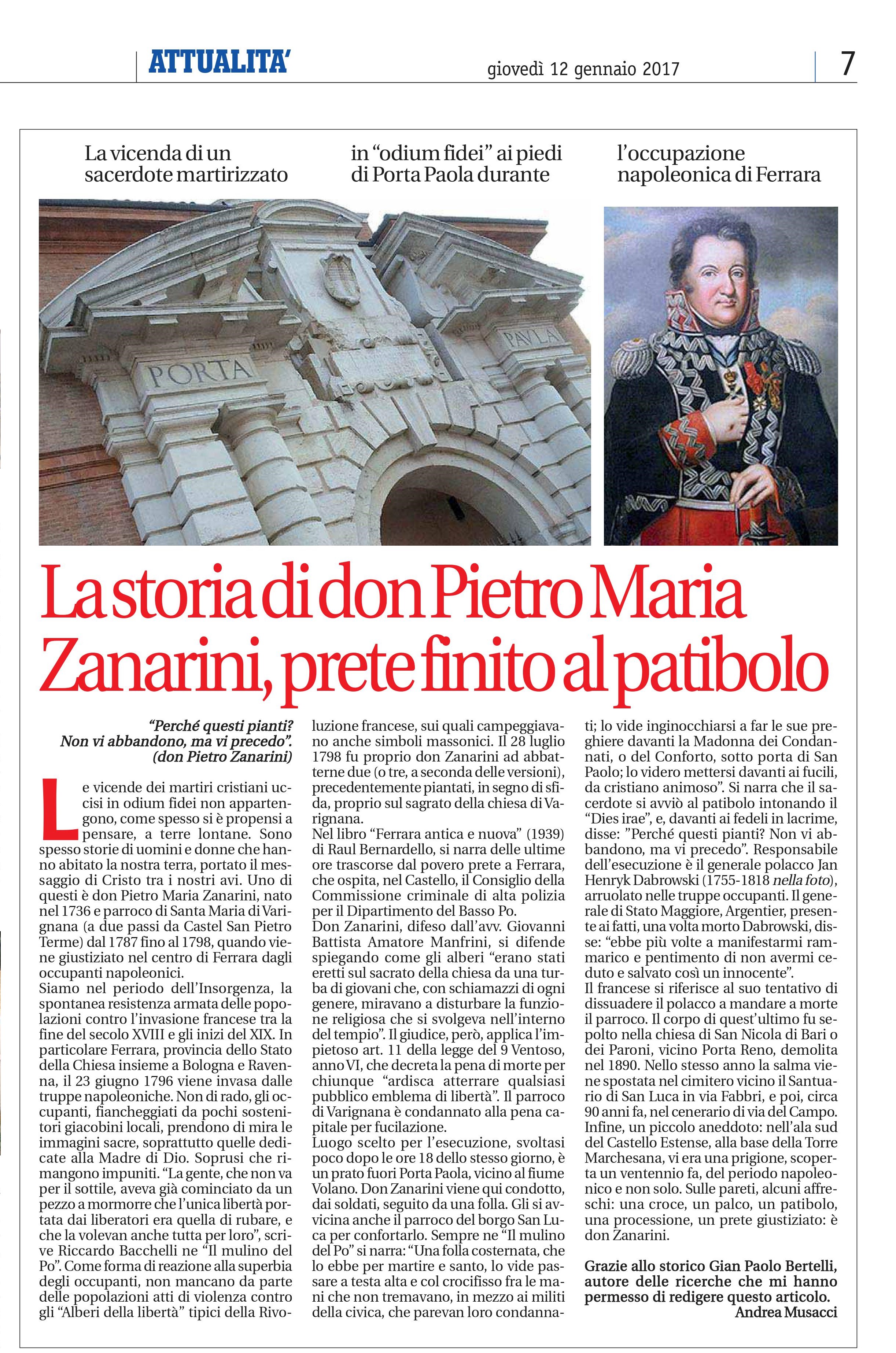 E' dedicata a don Pietro Maria Zanarini, sacerdote martirizzato a Ferrara (il 28 luglio 1798) dai repubblicani francesi durante l'occupazione napoleonica, la targa commemorativa che verrà ufficialmente scoperta venerdì 12 dicembre 2025 alle 10:00 nell'area antistante il Baluardo di San Paolo a Ferrara, nei pressi dell'accesso da via Kennedy al vialetto pedonale del Parcheggio Centro Storico (v. foto in allegato).
