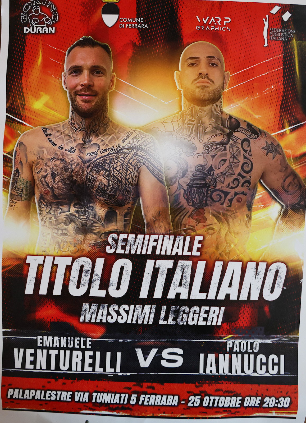Sabato 25 ottobre 2025 nella sede del Palapalestre di Ferrara avrà luogo la semifinale di boxe per l'assegnazione del titolo italiano dei pesi massimi leggeri. L'importante riunione pugilistica organizzata dall'Accademia Boxing Duran Ssd è stata presentata in resdienza municipale venerdì 24 ottobre 2025 in conferenza stampa da Francesco Carità, assessore allo Sport del Comune di Ferrara, Massimiliano Duran, organizzatore dell'evento, Soili Schiavi (Accademia Boxing Duran Ssd), insieme a Manuele Venturelli, pugile dell'Accademia Boxing Duran e Paolo Iannucci, il pugile sfidante.