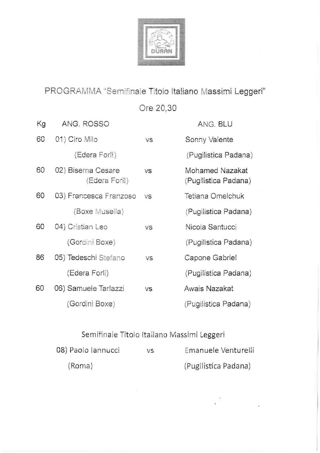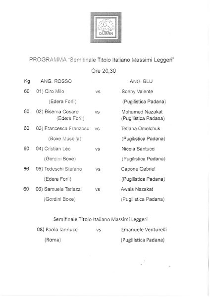 Questo il programma generale della riunione pugilistica in programma al Palapalestre di Ferrara a partire dalle 20.30 che culminerà con la sfida relativa alla semifinale per il Titolo Italiano Massimi Leggeri Emanuele Venturelli vs Paolo Iannucci: