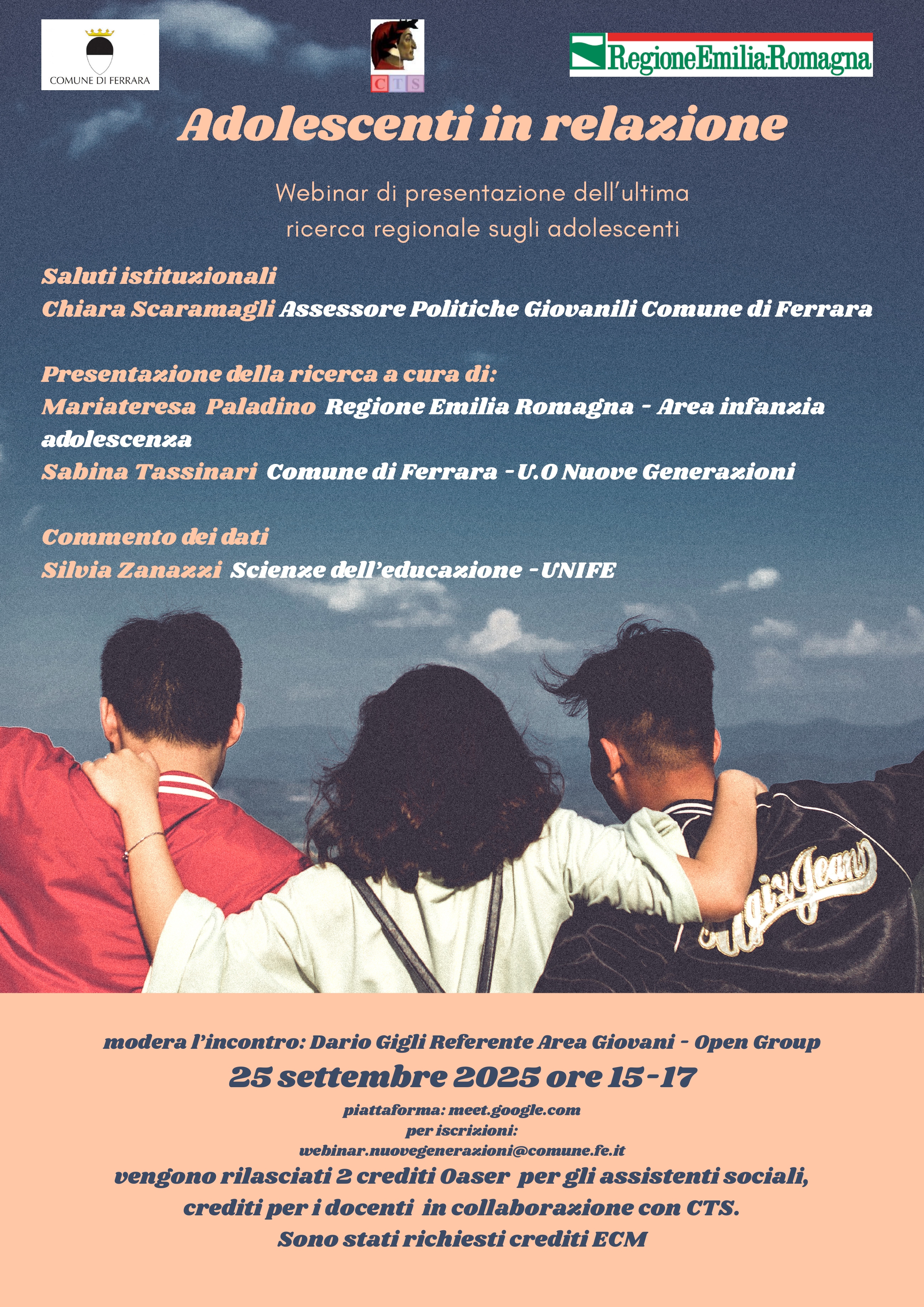 Le relazioni tra i giovani e gli adulti di riferimento saranno al centro del webinar "Adolescenti in relazione" in programma per giovedì 25 settembre 2025 dalle 15 alle 17, dove verrà presentata l'ultima ricerca dell'Osservatorio Adolescenti della UO Nuove Generazioni in collaborazione con la Regione Emilia Romagna.