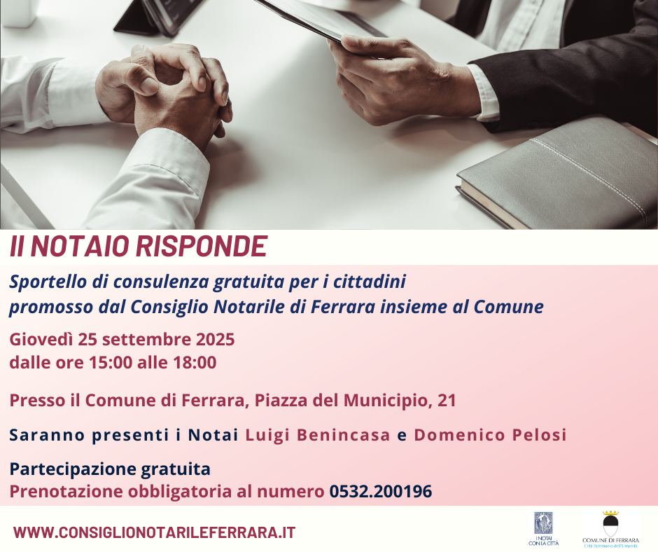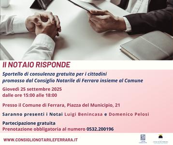 CONSIGLIO NOTARILE - Giovedì 25 settembre 2025 dalle 15:00 alle 18:00 nelle sale della residenza municipale di Ferrara