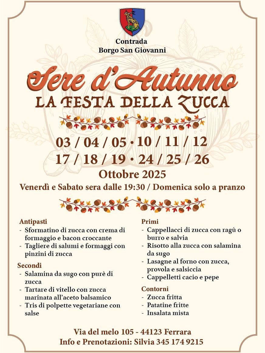 Per tutti i weekend di ottobre, l'accogliente sede della contrada di San Giovanni in via del Melo 105 a Ferrara ospiterà un trionfo di sapori e profumi dedicati a questo ortaggio eccezionale. Lo chef e il suo team hanno ideato un menù vario e creativo, dove la zucca è protagonista assoluta, declinata in ogni sua forma per soddisfare tutti i palati.