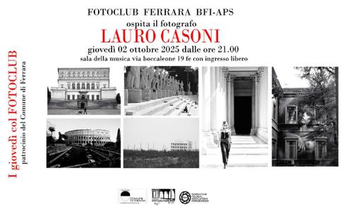 L'associazione culturale di promozione sociale Fotoclub Ferrara, con il patrocinio del Comune di Ferrara, prosegue gli incontri dei giovedì sera aperti a tutti, ospitando alcuni fotografi professionisti ferraresi. Giovedì 2 ottobre alle 21 nella sala della Musica sarà la volta di Lauro Casoni.