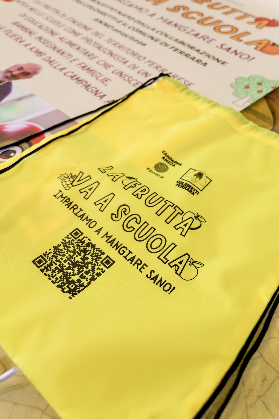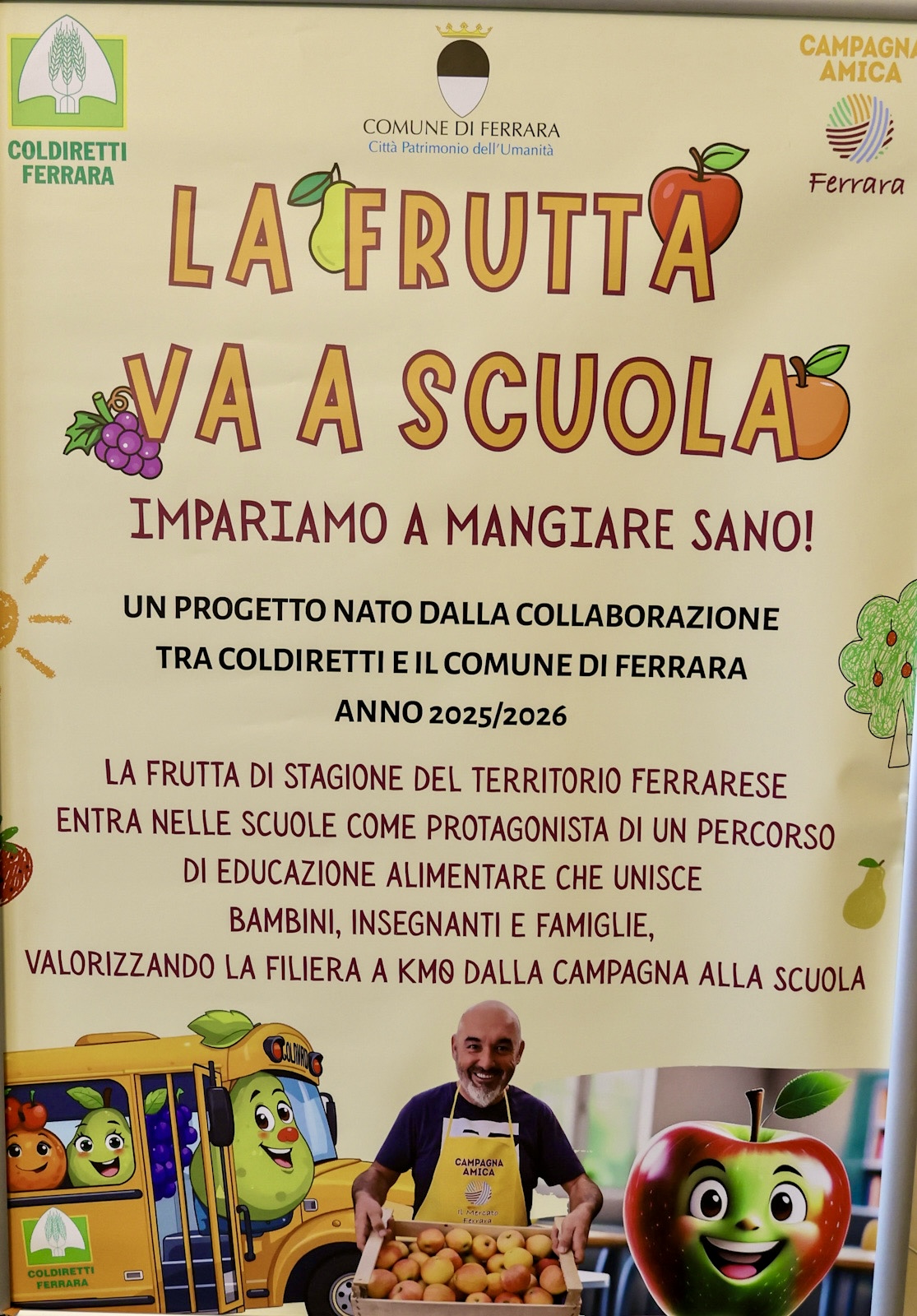 Su queste considerazioni e tenuto conto dell'importanza del settore agricolo nel territorio ferrarese, a partire dal comune capoluogo, si è incentrata l'idea progetto accolta dal Comune di Ferrara, per avviare una iniziativa pilota, finanziata dall'Amministrazione comunale, in vista di un possibile ampliamento anche a scuole primarie, secondarie ed all'Università, che sotto il titolo "LA FRUTTA VA A SCUOLA: impariamo a mangiare sano", vede la proposta iniziale di una serie di incontri in 15 strutture scolastiche (nidi ed infanzia) del Comune di Ferrara, nelle quali realizzare attività ludiche, laboratoriali, educative e di distribuzione di merende a base di frutta, con il coinvolgimento diretto dei bambini e degli agricoltori di Coldiretti, che nelle diverse classi interessate proporranno i temi delle stagioni della frutta, che nasce, cresce, matura ed infine arriva nel piatto per essere assaggiata, con racconti ed esperienze dirette, in un viaggio partecipato ed interattivo attraverso immagini, gesti, racconti e tradizioni ferraresi. Non mancheranno gadget e materiali multimediali di approfondimento, sia per gli insegnanti che per le famiglie.