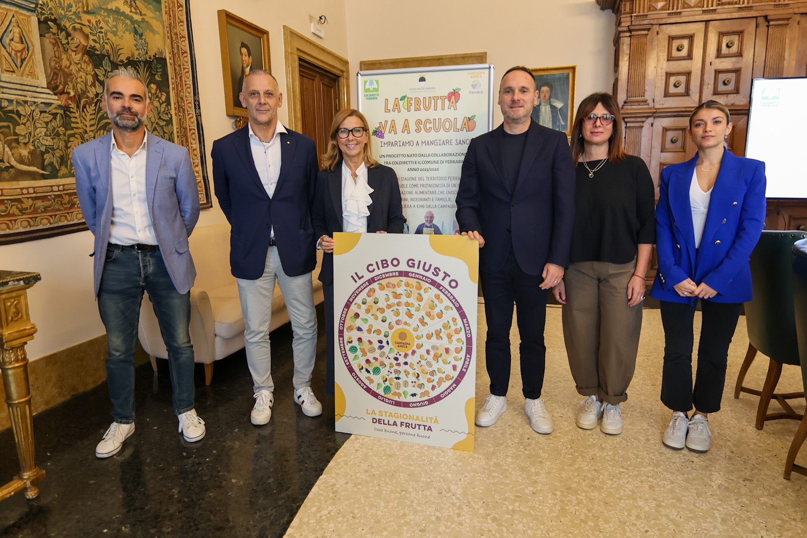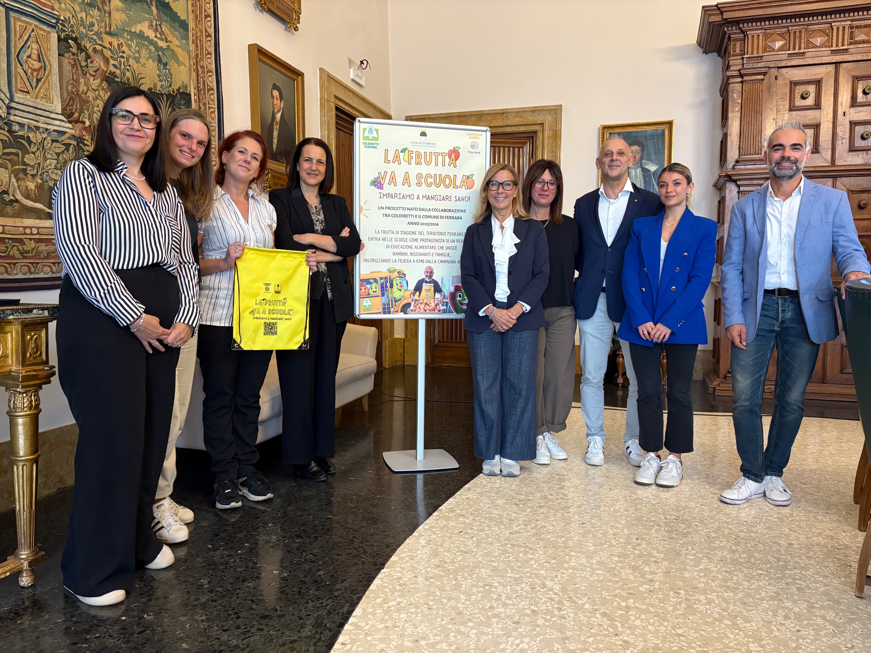 L'iniziativa è stata presentata oggi in conferenza stampa della residenza municipale di Ferrara dall'assessore comunale alla Pubblica Istruzione Chiara Scaramagli e dall'assessore comunale all'Agricoltura e Promozione del territorio Matteo Fornasini; con il direttore e il vice direttore di Coldiretti Ferrara Alessandro Visotti e Riccardo Casotti; Mara Bignardi del Servizio controllo qualità delle mense scolastiche comunali; il responsabile di "Campagna Amica" Stefano Menegatti; e Valentina Lattoli dell'ufficio segreteria di direzione ed eventi Coldiretti Ferrara.