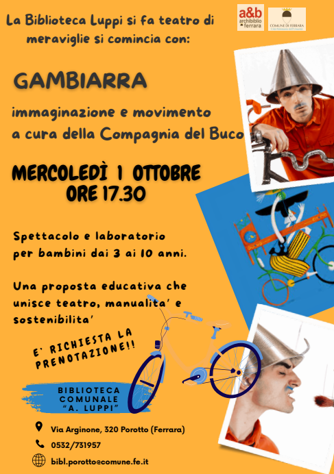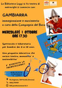 Sarà lo spettacolo teatrale "Gambiarra - Immaginazione in movimento" ad aprire, mercoledì 1 ottobre 2025 alle 17:30, la nuova stagione delle "Belle Storie" per bambini alla biblioteca comunale Aldo Luppi (via Arginone 320, Porotto, Ferrara). Lo spettacolo comico e poetico è ispirato all'omonimo libro illustrato di Bruno de Almeida.