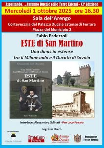 Evento anticipatore del programma culturale di "Autunno Ducale nelle Terre Estensi" quello in programma con la presentazione di uno straordinario Quaderno del Ducato. La vicenda degli "Este di San Martino - Una dinastia estense tra il Milanesado e il Ducato di Savoia" verrà raccontata nell'incontro che si terrà mercoledì 1 ottobre 2025 alle 16:30 nella Sala dell'Arengo all'interno della Cortevecchia Estense (oggi il Municipio cittadino, piazza Muncipio 2, Ferrara).