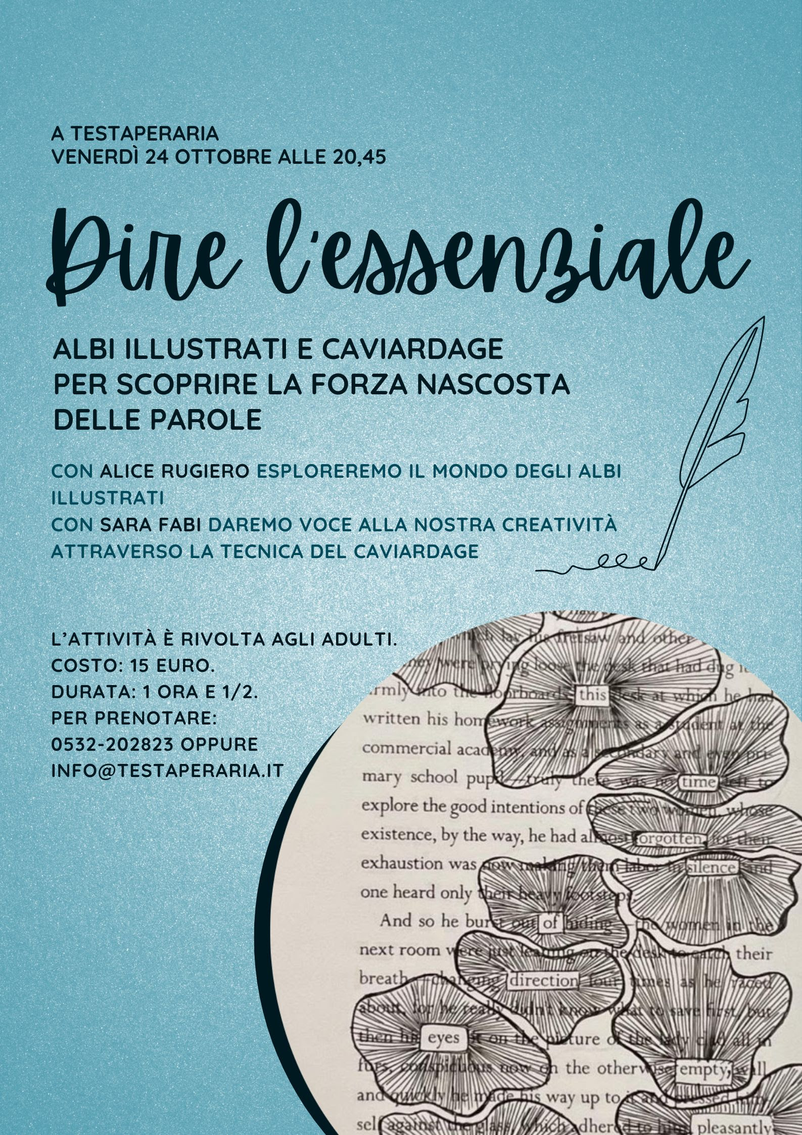 - Venerdì 24 ottobre 2025 alle 20:45 - "DIRE L'ESSENZIALE". Albi illustrati e caviardage per scoprire la forza nascosta delle parole.Con Alice Rugiero esploreremo il mondo degli albi illustrati; con Sara Fabi daremo voce alla nostra creatività attraverso la tecnica del caviardage. L'attività è rivolta agli adulti. Ha un costo di 15 euro e durata di 1 ora e mezzo.