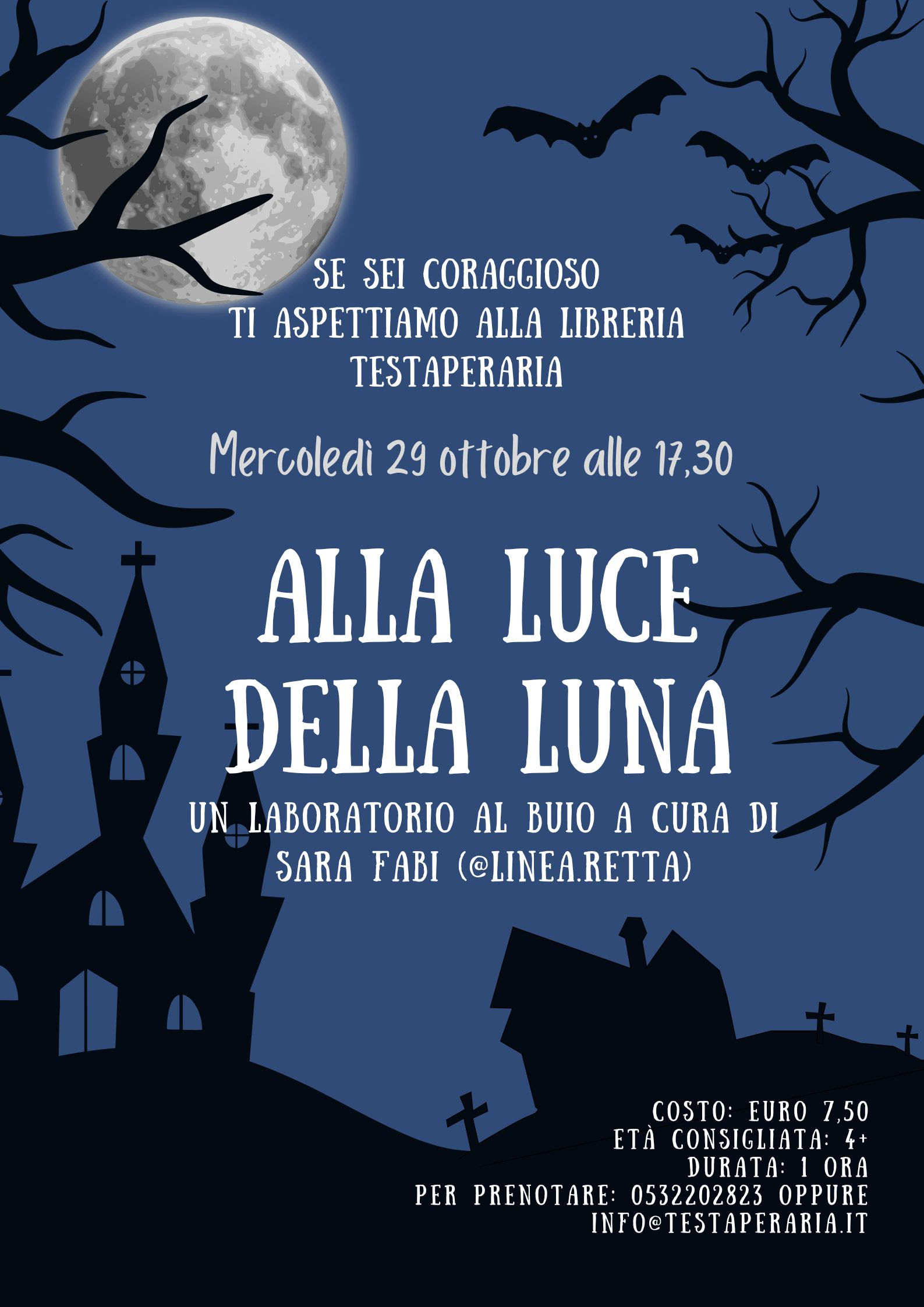 - Mercoledì 29 ottobre 2025 alle 17:30 - "ALLA LUCE DELLA LUNA". Se sei coraggioso, ti aspettiamo in libreria per un laboratorio al buio a cura di Sara Fabi. Realizzeremo un paesaggio spettrale a misura di lanterna. Dedicato a bambini dai 4. Il costo è di euro 7,50 e la durata di 1 ora.