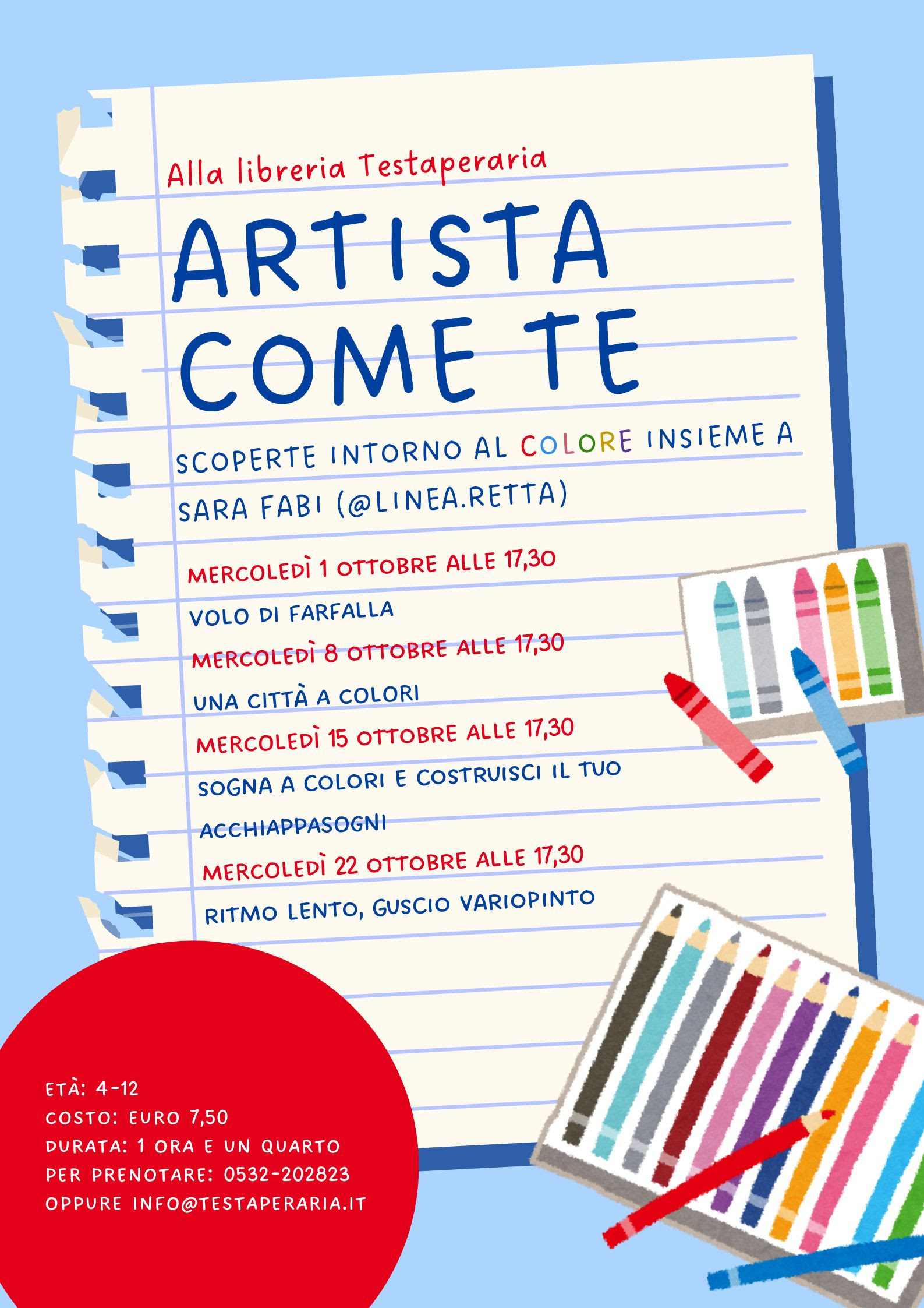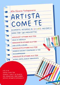 - Mercoledì 1 - 8 - 15 - 22 ottobre 2025 alle 17:30 - "ARTISTA COME TE". Nel mese di ottobre i laboratori creativi di Sara Fabi, ogni mercoledì pomeriggio in libreria, saranno tutti dedicati alle scoperte intorno al colore. Per bambini dai 4 anni.