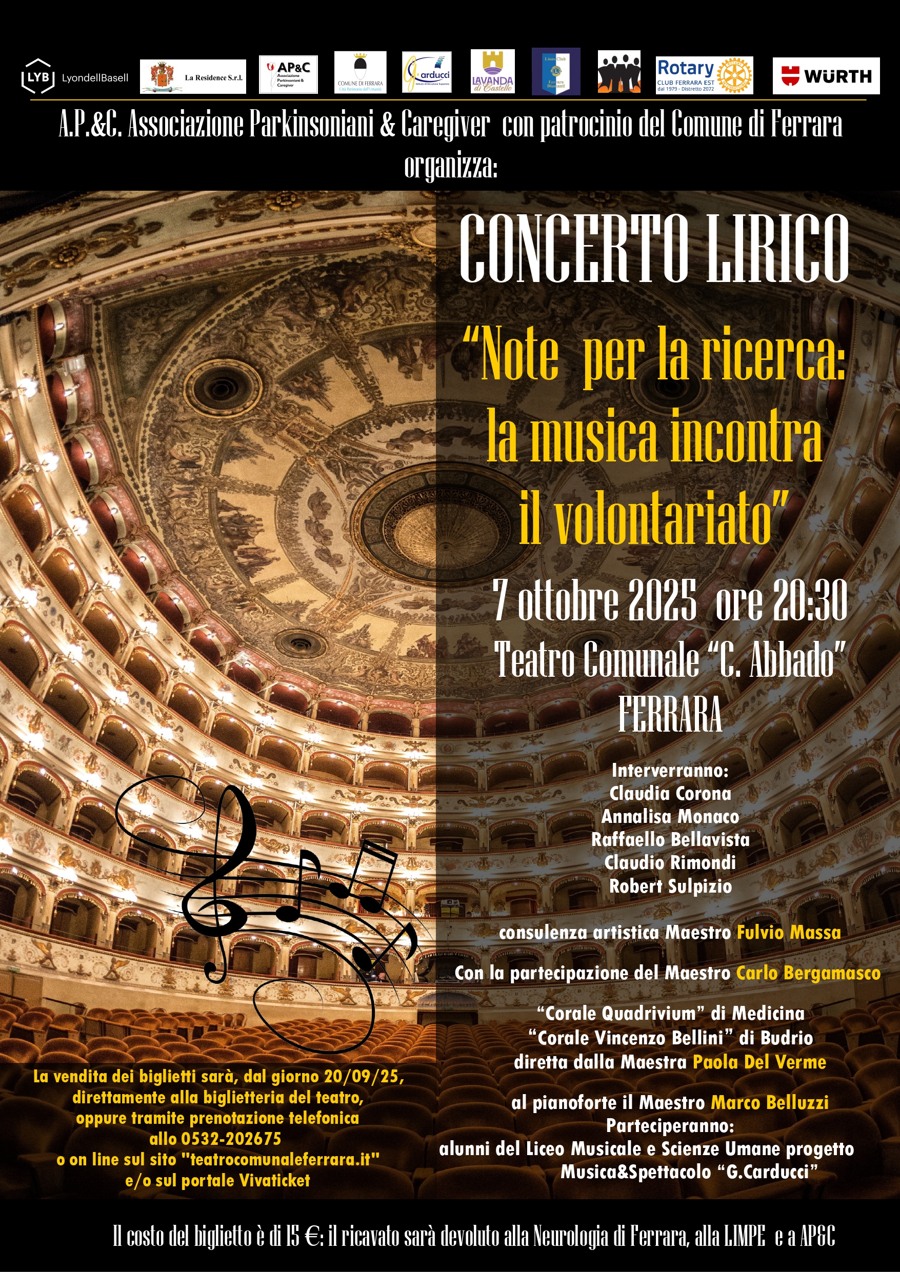 Quando l'arte, la musica e la solidarietà si fondono non può che nascere qualcosa di bello, e ne è un esempio concreto il concerto "Note per la ricerca: la musica incontra il volontariato". La musica diventa nuovamente uno strumento di solidarietà al Teatro Comunale di Ferrara, martedì 7 ottobre alle 20.30, dove andrà in scena il concerto lirico promosso dall'Associazione Parkinsoniani & Caregiver, con il patrocinio e il contributo di 1000 euro dell'Assessorato alle Politiche Sociosanitarie del Comune di Ferrara e il supporto della Fondazione Teatro Comunale, oltre che di numerosi sponsor e partner.
