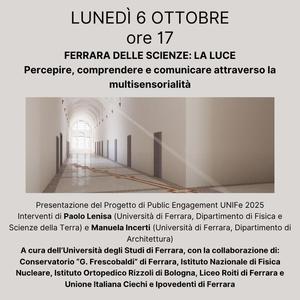 Nel corso dell'evento saranno presentati i contenuti e le modalità di attuazione del progetto di Public Engagement 2025, finanziato dall'Università degli Studi di Ferrara, dal titolo Ferrara delle Scienze: la Luce. Percepire, comprendere e comunicare attraverso la multisensorialità (responsabili: proff. Paolo Lenisa e Manuela Incerti). Scopo del progetto è trasmettere conoscenze relative al tema della luce in un'ottica inclusiva, accessibile e multisensoriale, approfondendo i principali aspetti legati alle tecnologie innovative e ai molteplici risvolti scientifici, artistici e culturali.
