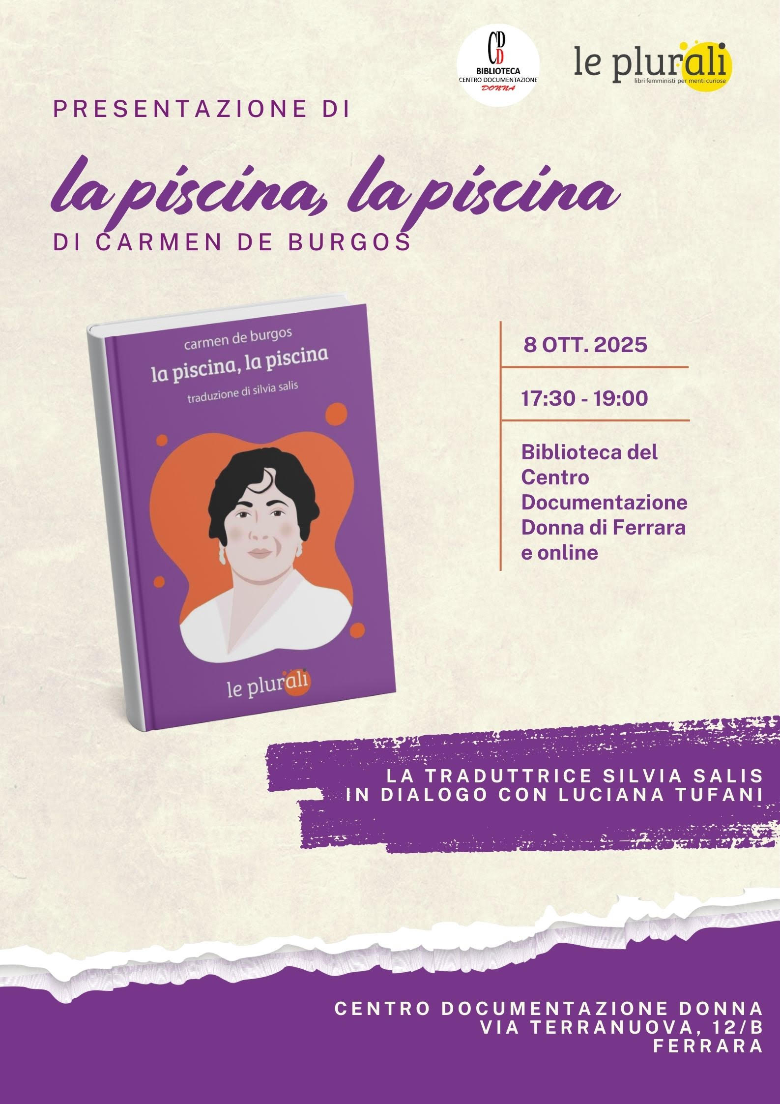 SCHEDA a cura del Centro Documentazione Donna - "La piscina, la piscina" (Le Plurali 2024) è un romanzo breve di Carmen de Burgos, autrice prolifica, giornalista e femminista spagnola (1867-1932). In questo, come in altri suoi romanzi, l'autrice racconta di donne indipendenti che rifiutano gli standard di comportamento femminile imposti dalla società patriarcale. Ironica, affilata, beffarda, de Burgos prende in giro l'arretratezza e l'ipocrisia della famiglia e della società spagnola, mettendo in ridicolo la mentalità machista e chiusa di fronte al percorso inarrestabile delle donne verso la libertà.