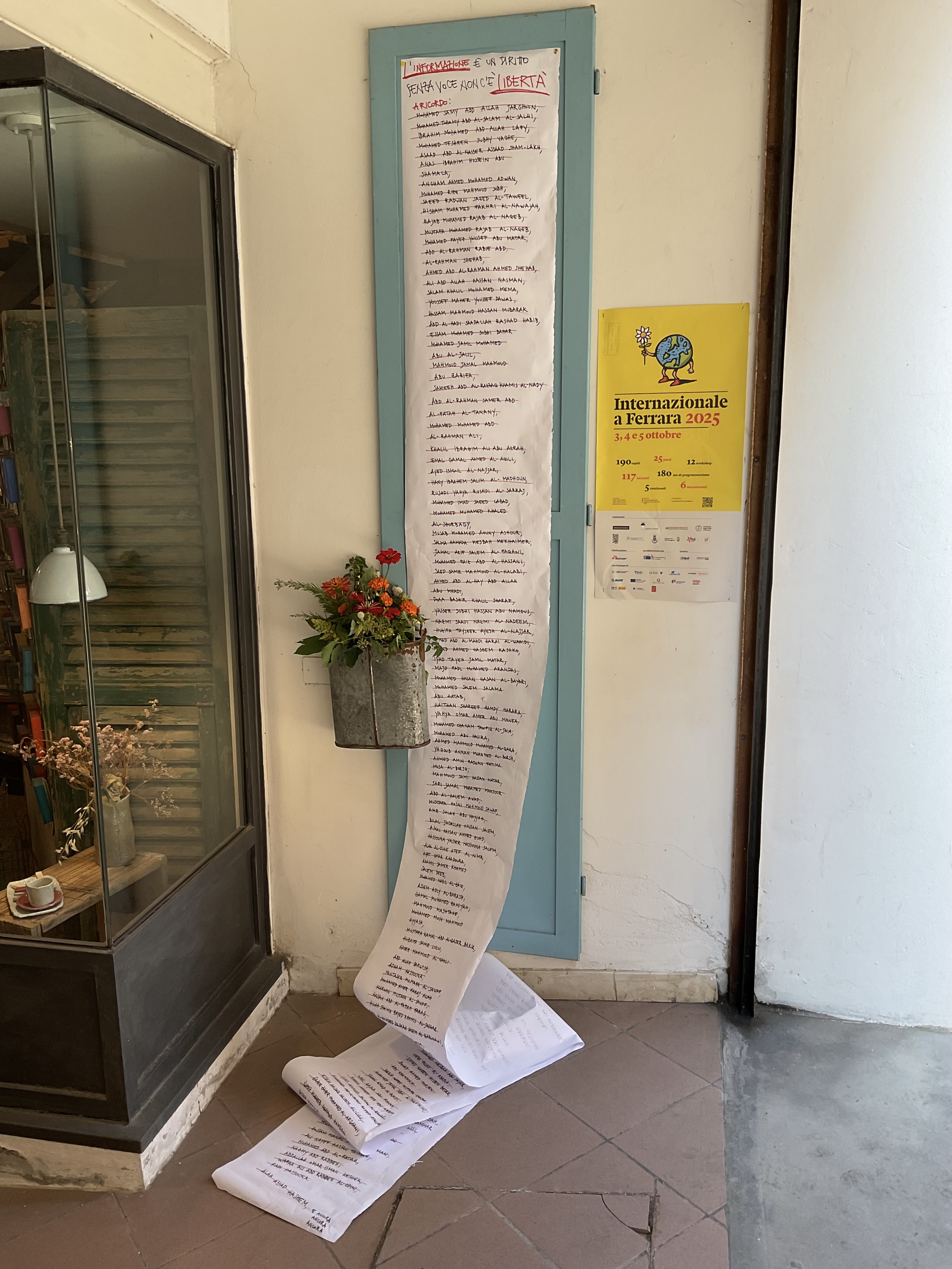 L'associazione di promozione sociale Spazio Aperto Ferrara, bottega creativa di via Carlo Mayr 69, rende omaggio ai 285 giornalisti uccisi dall'ottobre 2023 a Gaza. L'istallazione realizzata ed esposta all'ingresso della sede (vedi foto) vuole essere un sostegno attivo a tutti i giornalisti presenti nella nostra città in occasione del Festival Internazionale e un omaggio concreto al loro lavoro, al diritto di cronaca e alla libertà di stampa.