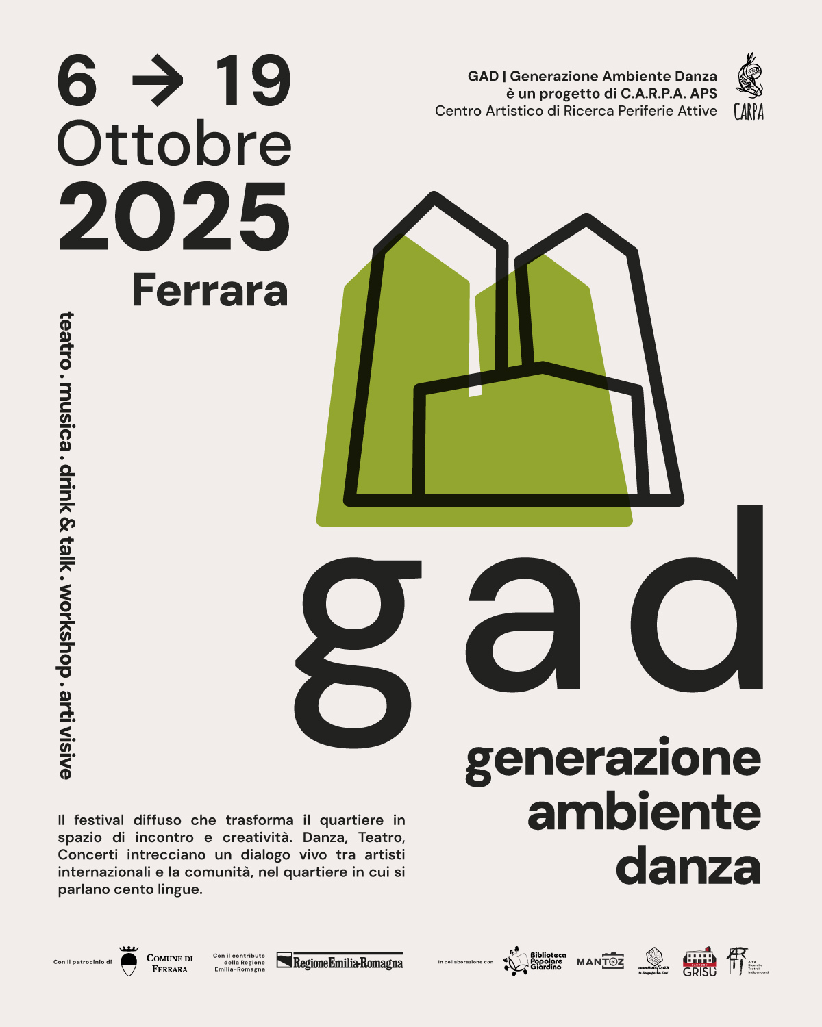 Tredici giorni di spettacoli per 38 appuntamenti, che impegnano 29 compagnie e artisti da 8 paesi diversi, che renderanno il quartiere Giardino il centro del mondo. Dal 6 al 19 ottobre 2025 arriva a Ferrara il Gad Festival, dove Gad sta per Generazione Ambiente Danza. Dal parco Coletta al Factory Grisù, passando per piazza Castellina, saranno 13 giorni in cui spettacoli, concerti, proiezioni, laboratori e attività per bambini e famiglie porteranno nel quartiere artisti provenienti da paesi come Giappone, Svezia, Polonia e India. La manifestazione è promossa da Carpa Aps, con il contributo della Regione Emilia-Romagna, il patrocinio e la collaborazione dell'Assessorato alla Sicurezza del Comune di Ferrara.