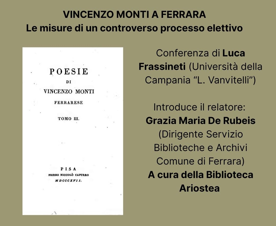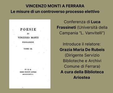 Avrà come tema "Vincenzo Monti e Ferrara: le misure di un controverso processo elettivo" la conferenza di Luca Frassineti in programma venerdì 10 ottobre 2025 alle 17:00 nella sala Agnelli della biblioteca comunale Ariostea (via delle Scienze 17, Ferrara).