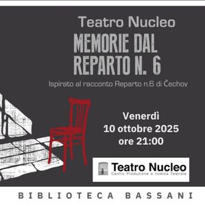 LA SCHEDA (a cura degli organizzatori) - La Biblioteca Giorgio Bassani, in collaborazione con Teatro Nucleo, ospita lo spettacolo teatrale:Liberamente ispirato al racconto Il Reparto n. 6 di Anton Čechov, lo spettacolo è una riflessione intensa e attuale sul tema della salute mentale, a quarant'anni dalla Legge Basaglia. Un viaggio tra le mura di un manicomio, alla ricerca delle voci e delle verità cancellate, che intreccia teatro civile e poesia.