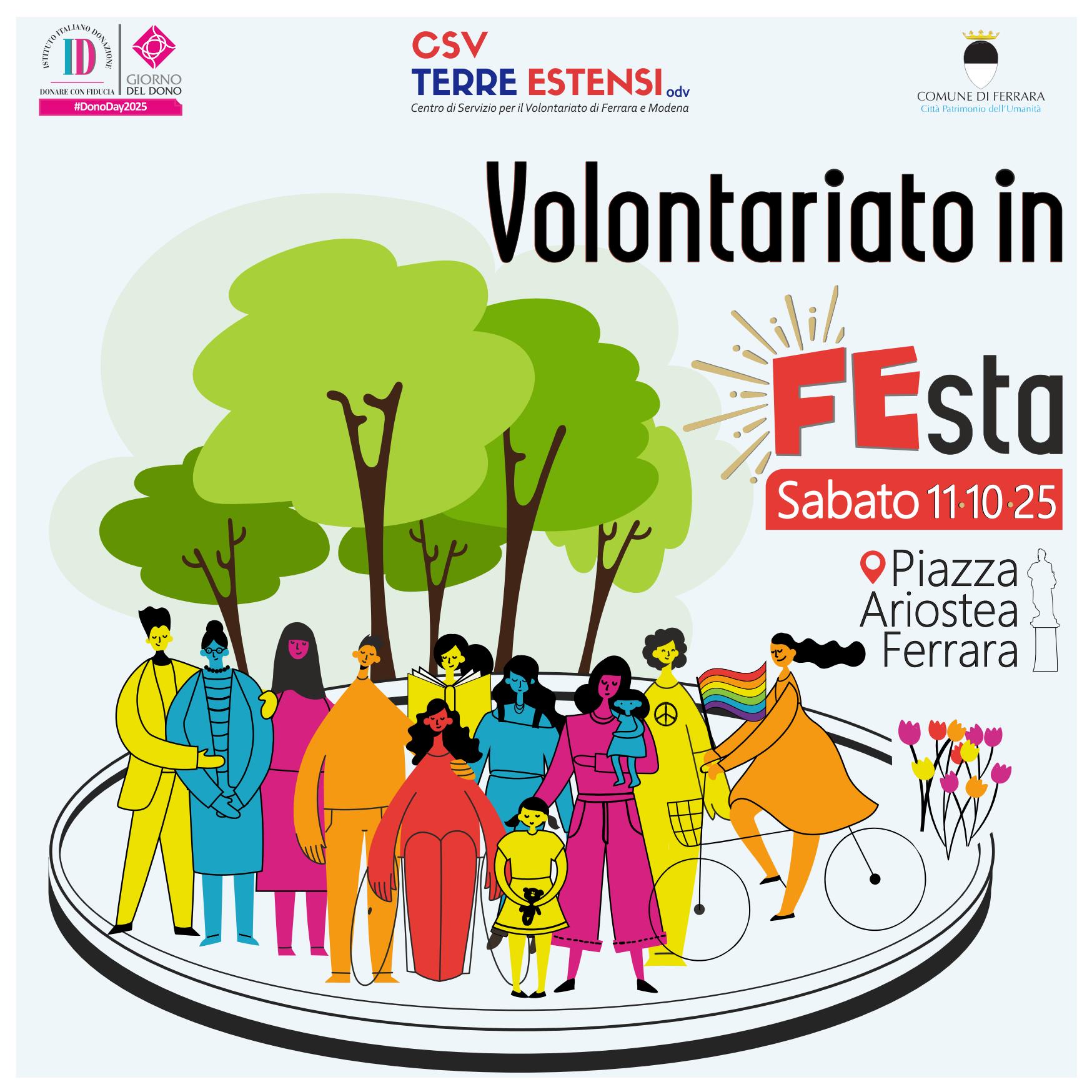 Saranno circa 65 le associazioni partecipanti, sabato 11 ottobre dalle 8.30 alle 18.30 in piazza Ariostea a Ferrara, a "Volontariato in Festa", la festa del volontariato di Ferrara. Quest'anno il filo conduttore della manifestazione sarà il tema del dono, declinato nei suoi molteplici aspetti dai volontari delle realtà associative cittadine, che porteranno in piazza laboratori e tante iniziative per incontrare la comunità. L'evento aderisce al Giorno del Dono, istituito per legge il 4 ottobre ogni anno, promosso dall'Istituto Italiano della Donazione (IID) per diffondere e celebrare i valori della solidarietà e della donazione in tutta Italia. Volontariato in Festa raggiunge quest'anno la terza edizione e l'adesione è da record, a dimostrazione della vitalità e varietà del terzo settore che anima la città e le sue frazioni. I promotori sono il Centro Servizi per il Volontariato Terre Estensi insieme alle associazioni del territorio comunale, con il patrocinio del Comune di Ferrara.