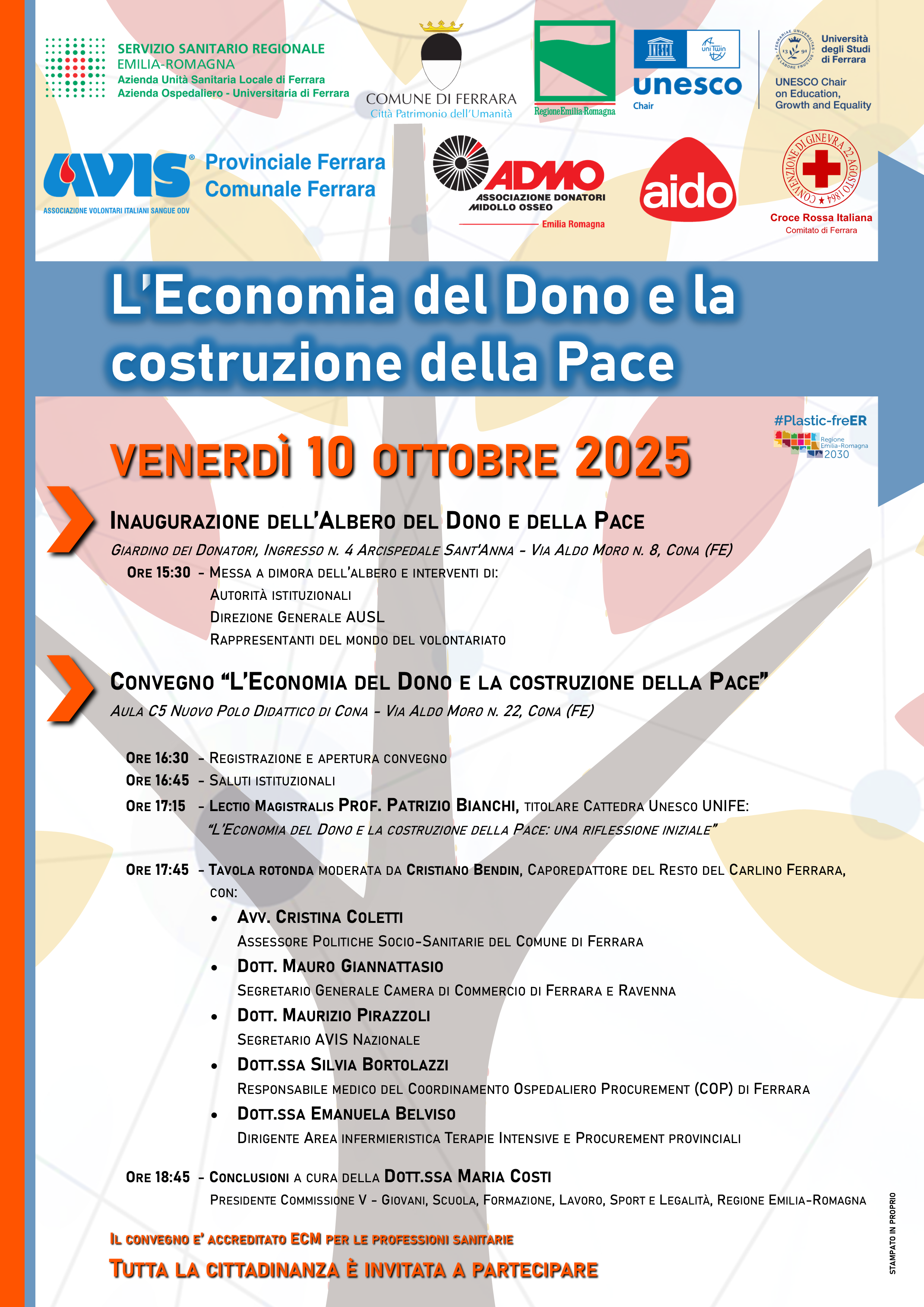 Avis Provinciale e Avis Comunale Ferrara, in collaborazione con AIDO, ADMO e Croce Rossa Italiana, hanno organizzato una duplice iniziativa aperta a tutta la cittadinanza, che si terrà venerdì 10 ottobre 2025, a partire dalle ore 15:30, presso l'Ospedale di Cona, come dettagliato nella locandina allegata. La prima parte dell'evento si svolgerà nell'area antistante l'ingresso n. 4 e prevede la messa a dimora di un albero simbolico, denominato "Albero del Dono e della Pace", che sarà inserito all'interno del Giardino dei Donatori. Alla sua base verrà collocato un mosaico raffigurante simboli universali della pace. A seguire, si terrà un convegno intitolato "L'Economia del Dono e la costruzione della Pace", promosso da AVIS in sinergia con la Direzione delle Aziende Sanitarie Ferraresi e con il contributo del Prof. Patrizio Bianchi, già Ministro della Repubblica e Rettore dell'Università di Ferrara, attualmente titolare della Cattedra UNESCO.