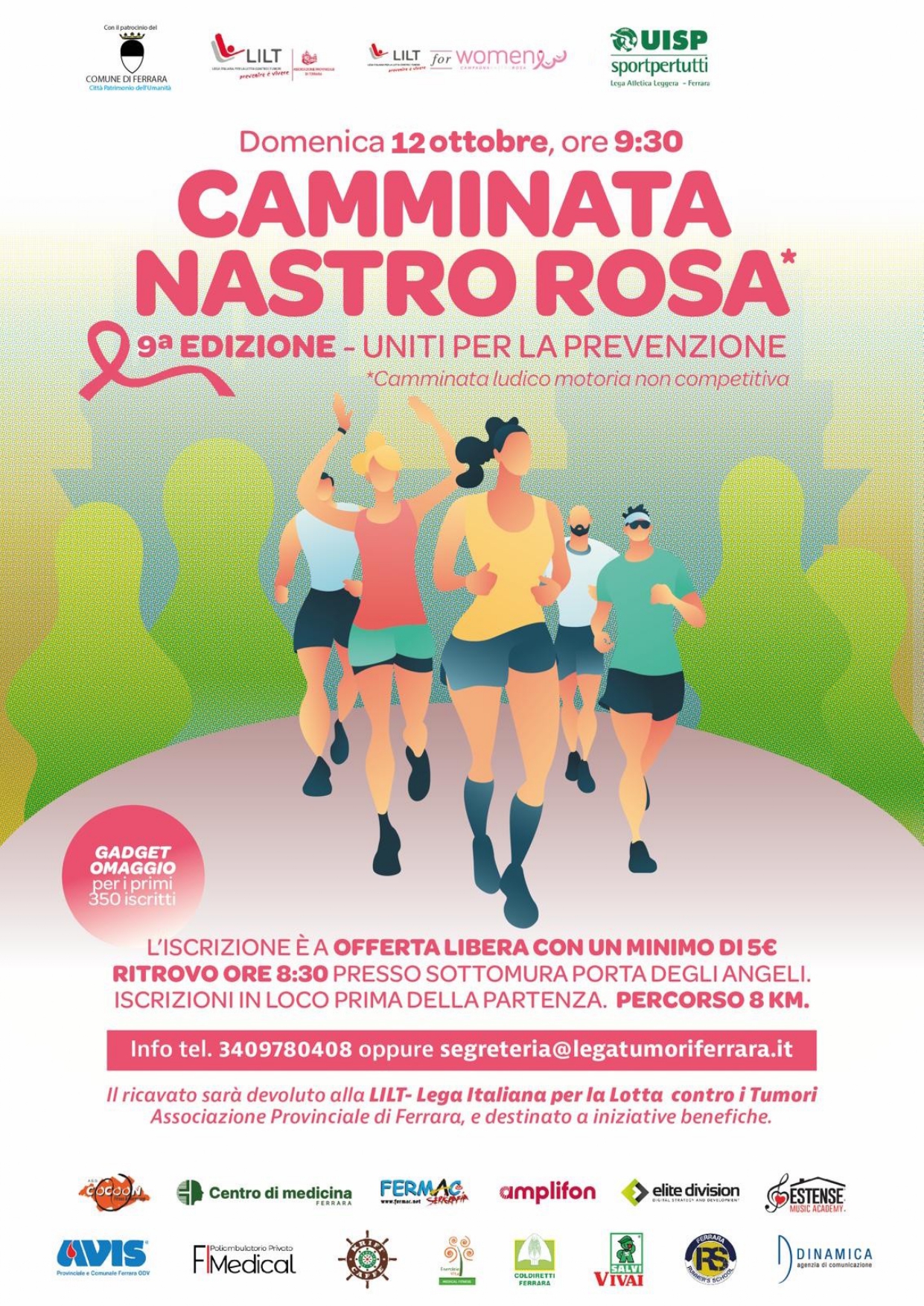 Nell'Ottobre Rosa, il mese della prevenzione dei tumori, la prevenzione si allaccia le scarpette e cammina sulle Mura estensi. Domenica 12 ottobre 2025 alle ore 9.30 prenderà il via la 9a edizione della "Camminata Nastro Rosa", camminata non competitiva promossa da Lilt con il sostegno dell'Assessorato alle Politiche Sociosanitarie del Comune di Ferrara. Nel mese rivolto alla sensibilizzazione del tumore al seno, questa iniziativa si rivolge alla conoscenza e alla raccolta fondi in favore delle attività realizzate sul territorio da Lilt.