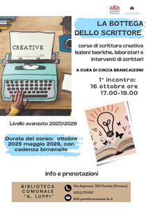 Riprendono, giovedì 16 ottobre 2025 alle 17:00, alla biblioteca comunale Aldo Luppi (via Arginone 320, Porotto), gli incontri de "La bottega dello scrittore", il corso di scrittura creativa a cura di Cinzia Brancaleoni. Il corso, che costituisce il livello avanzato rispetto a quello dell'anno precedente, si concluderà a maggio 2026, con appuntamenti a cadenza bimensile della durata di circa un'ora e mezza ciascuno.