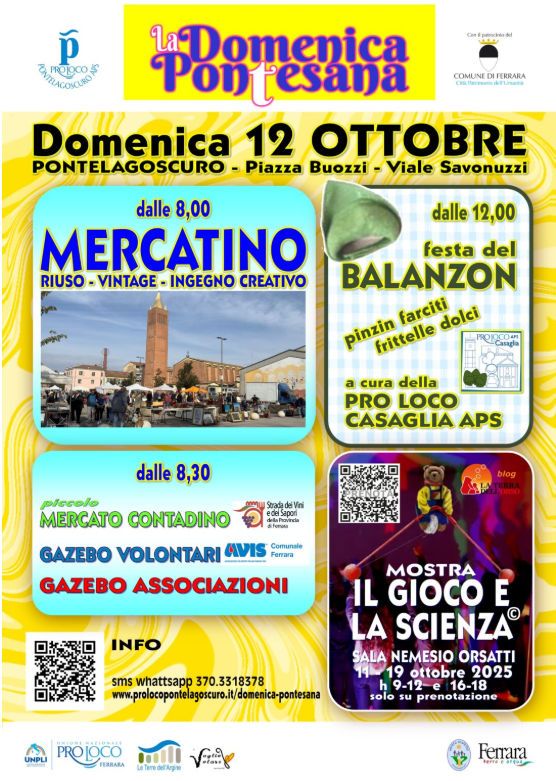 Domenica ricca di appuntamenti il prossimo 12 ottobre 2025 a Pontelagoscuro. Dalle 8:00 alle 18:00, in piazza Buozzi e viale Savonuzzi, si terrà "La domenica Pontesana" organizzata dalla Pro Loco Pontelagoscuro APS, in collaborazione con il Comune di Ferrara - Assessorato alle Fiere/Sagre e Mercati. Ad animare la piazza ci saranno il mercato del vintage e del riuso, insieme a gazebo e punti informativi di associazioni del territorio, oltre alla mostra "Il Gioco e la Scienza" nella Sala Nemesio Orsatti. Dalle 12 "La Festa del balanzon" con pinzini e frittelle a cura della Pro loco di Casaglia.