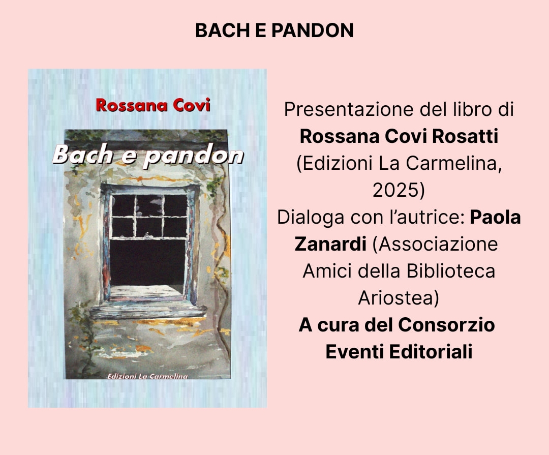 Offre uno sguardo sul passato, in un intreccio di avvenimenti e storie di ferraresi umili ma ricchi di una nobile eredità morale, il nuovo libro di Rossana Covi intitolato "Bach e pandon" che sarà presentato venerdì 17 ottobre 2025 alle 17:00 nella sala Agnelli della biblioteca comunale Ariostea (via delle Scienze 17, Ferrara).