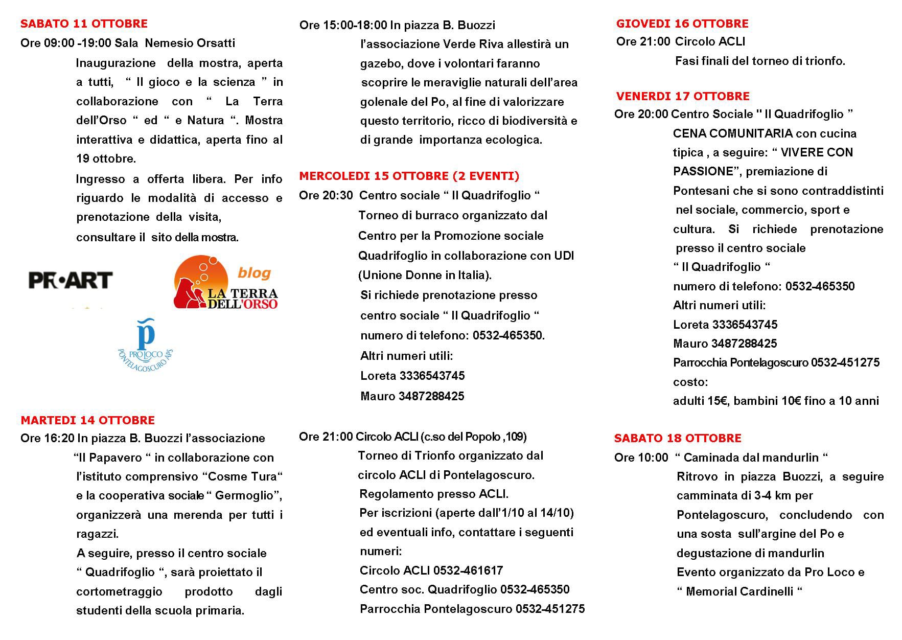 Ricco calendario di appuntamenti a Pontelagoscuro con l'Antica Fiera di Santa Teresa che mette in campo tante iniziative e mercatini artigianali da sabato 11 fino a domenica 19 ottobre con il tradizionale luna park in arrivo con le giostre da giovedì 16 a mercoledì 21 ottobre 2025.