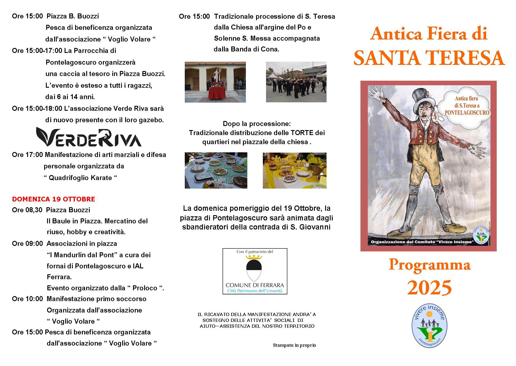 Nelle foto alcuni momenti della presentazione della Fiera Santa Teresa di Pontelagoscuro con l'ass. Angela Travagli e il pieghevole con il programma, che riporta l'illustrazione storica di Walter Ferrari