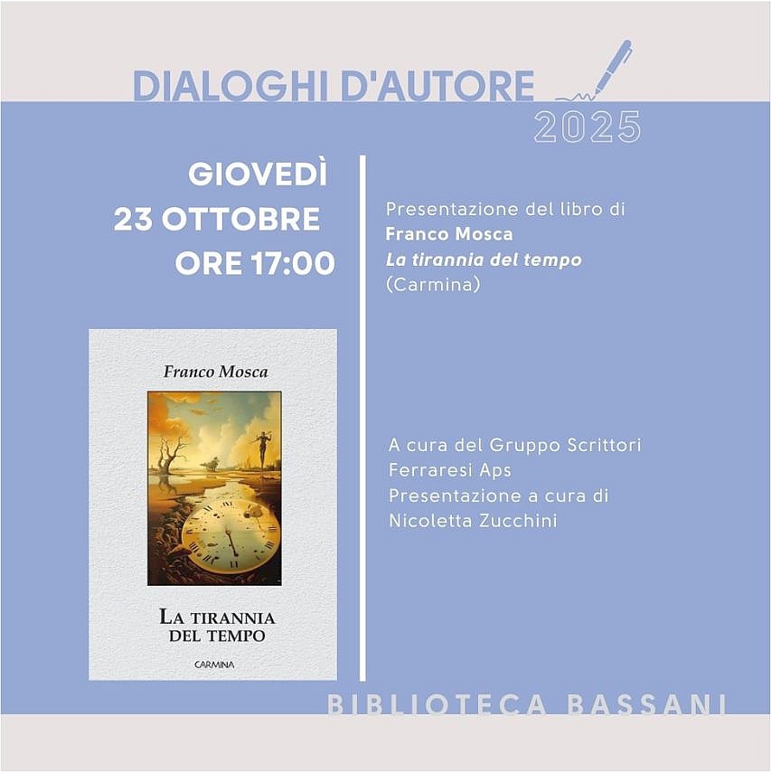 Raccoglie tre diverse sillogi poetiche firmate da Franco Mosca il libro "La tirannia del tempo" che giovedì 23 ottobre alle 17:00 sarà protagonista del quinto appuntamento del mese con "Dialoghi d'autore", alla biblioteca comunale Bassani (via Grosoli 42, Barco, Ferrara).