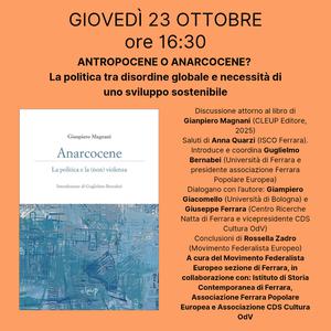 Avrà come tema "La politica tra disordine globale e necessità di uno sviluppo sostenibile" il dibattito ispirato dal libro di Gianpiero Magnani intitolato "Anarcocene - La politica della non violenza" in programma giovedì 23 ottobre 2025 alle 17:00 nella sala Agnelli della biblioteca comunale Ariostea (temporaneo ingresso da via Romiti 13, Ferrara).