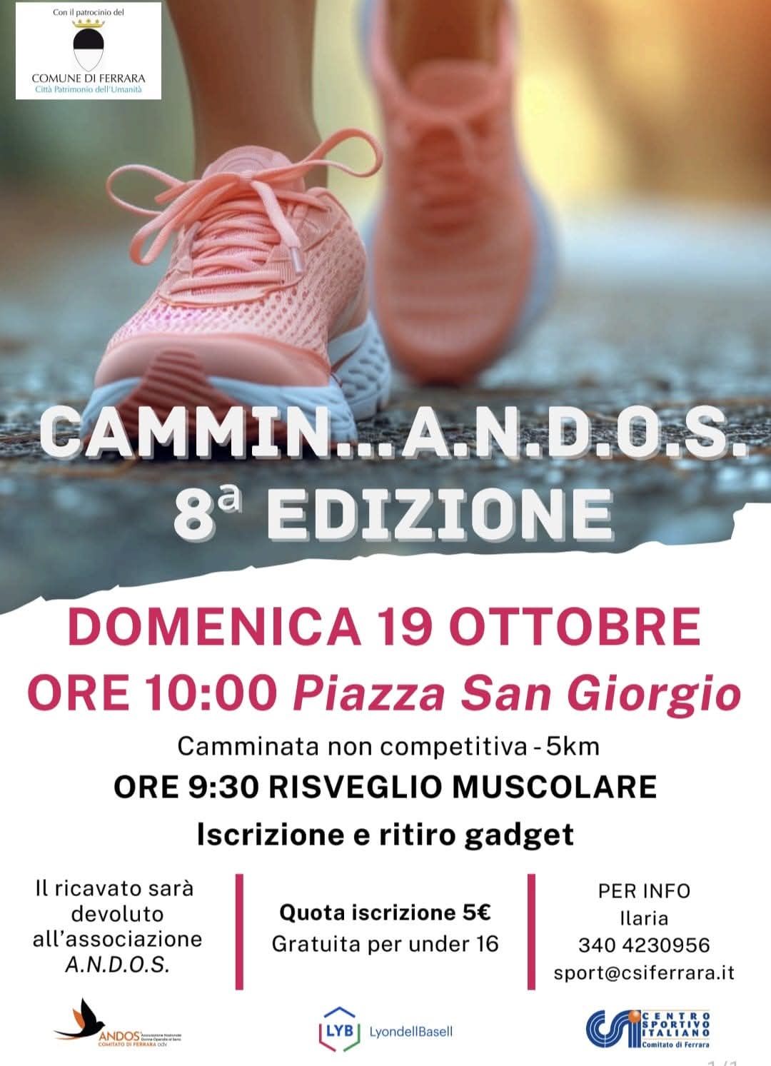 A Ferrara la prevenzione e la sensibilizzazione sul tumore al seno si muovono a passo spedito grazie all'ottava edizione di "Cammin...Andos". Dopo il rinvio per maltempo di due settimane fa, domenica 19 ottobre 2025 dalle 9:30, nuovo appuntamento, in piazza San Giorgio, con la manifestazione benefica che unisce la promozione dei corretti stili di vita alla beneficenza, in un mese fondamentale per la prevenzione come l'"Ottobre Rosa". L'iniziativa, che va sempre più consolidandosi, è organizzata da Csi-Centro Sportivo Italiano Ferrara e LyondellBasell, a favore del Comitato Andos (Associazione Nazionale Donne Operate al Seno), che beneficerà del ricavato.