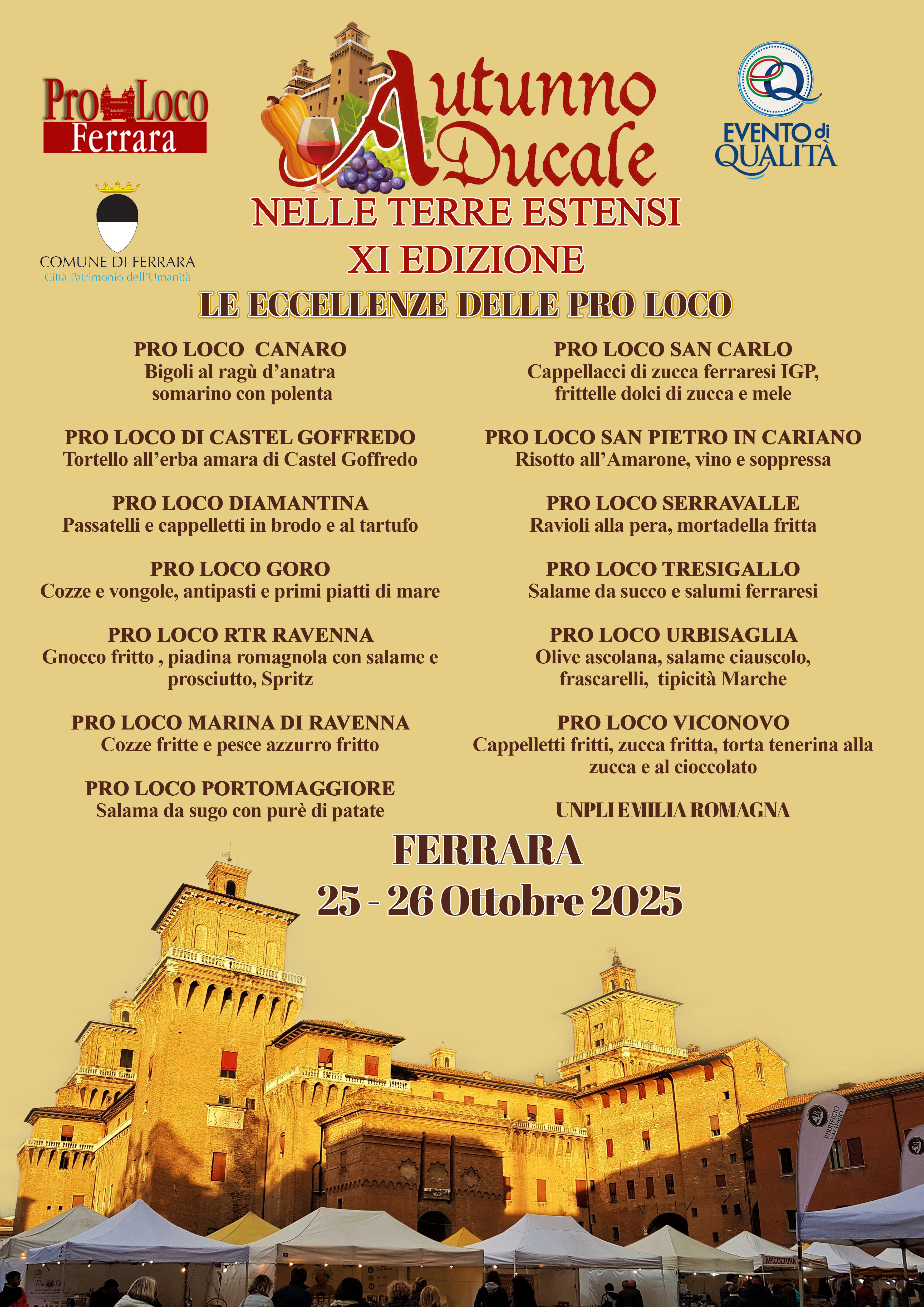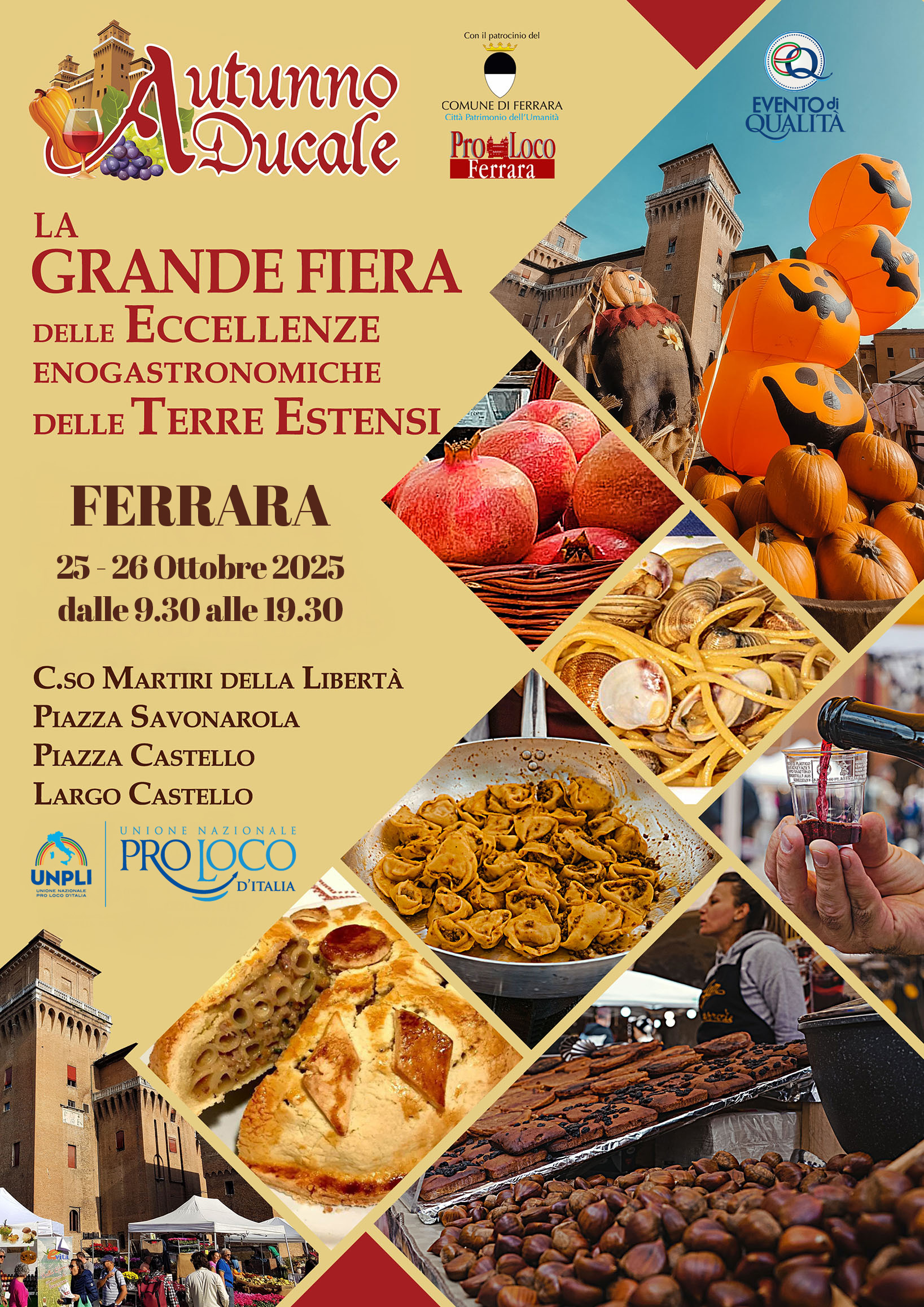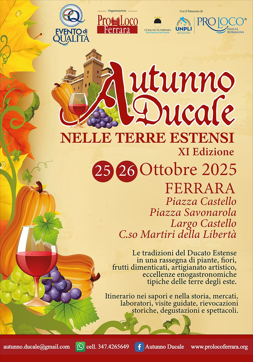 Tradizioni del Ducato Estense protagoniste con "Autunno Ducale nelle Terre Estensi" in programma sabato 25 e domenica 26 ottobre 2025 nel centro storico di Ferrara. L'iniziativa, alla sua XI edizione, mette insieme eccellenze enogastronomiche tipiche delle terre degli Este con artigianato artistico, visite guidate, rievocazioni storiche, degustazioni, spettacoli e rassegna di prodotti caratterizzati da biodiversità e presidi Slow Food, frutti dimenticati e piante nei banchi allestiti in corso Martiri della Libertà, largo Castello e piazze Savonarola, Repubblica e Castello dalle 9:30 alle 20:00.