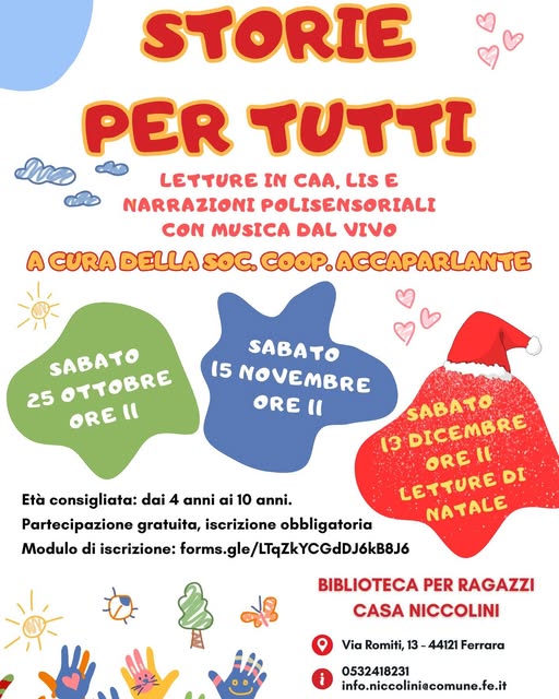 Un sabato mattina dedicato alla lettura in CAA (Comunicazione Aumentativa e Alternativa), LIS (Lingua dei Segni Italiana) e narrazioni multisensoriali accompagate da musica dal vivo per bambini dai 4 anni. L'appuntamento, a cura della cooperativa sociale Accaparlante è per sabato 25 ottobre 2025 alle 11:00 alla biblioteca comunale Casa Niccolini (via Romiti 13, Ferrara). In programma il primo di tre appuntamenti con tante storie per tutti, divertenti e accessibili, in CAA, accompagnate da esperienze polisensoriali e dall'interprete della Lingua dei Segni.