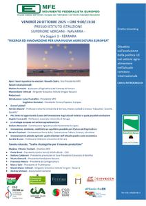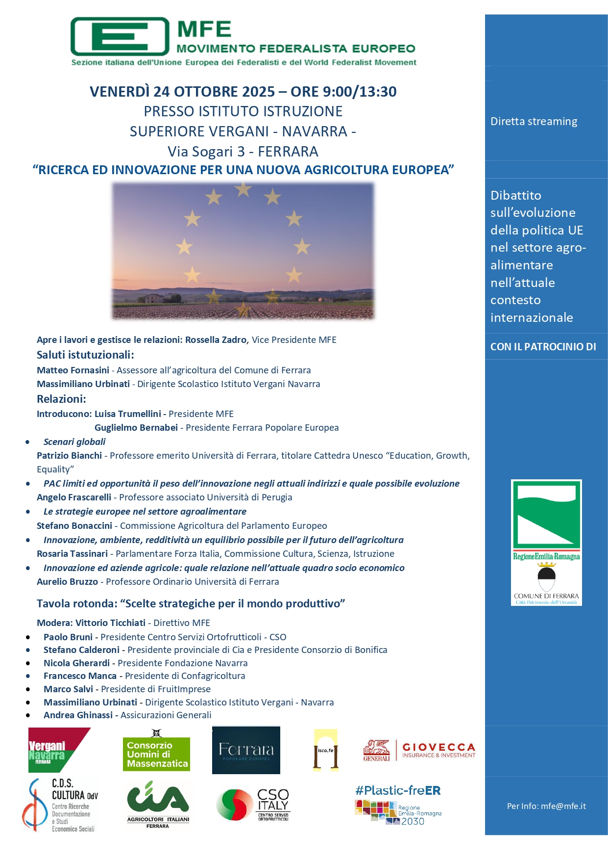 Pertanto il 24 ottobre 2025 dalle ore 9 alle ore 13,30, presso l'Istituto di Istruzione Superiore Vergani Navarra, via Sogari 3 Ferrara, si dibatterà su "Ricerca ed innovazione per una nuova agricoltura europea".
