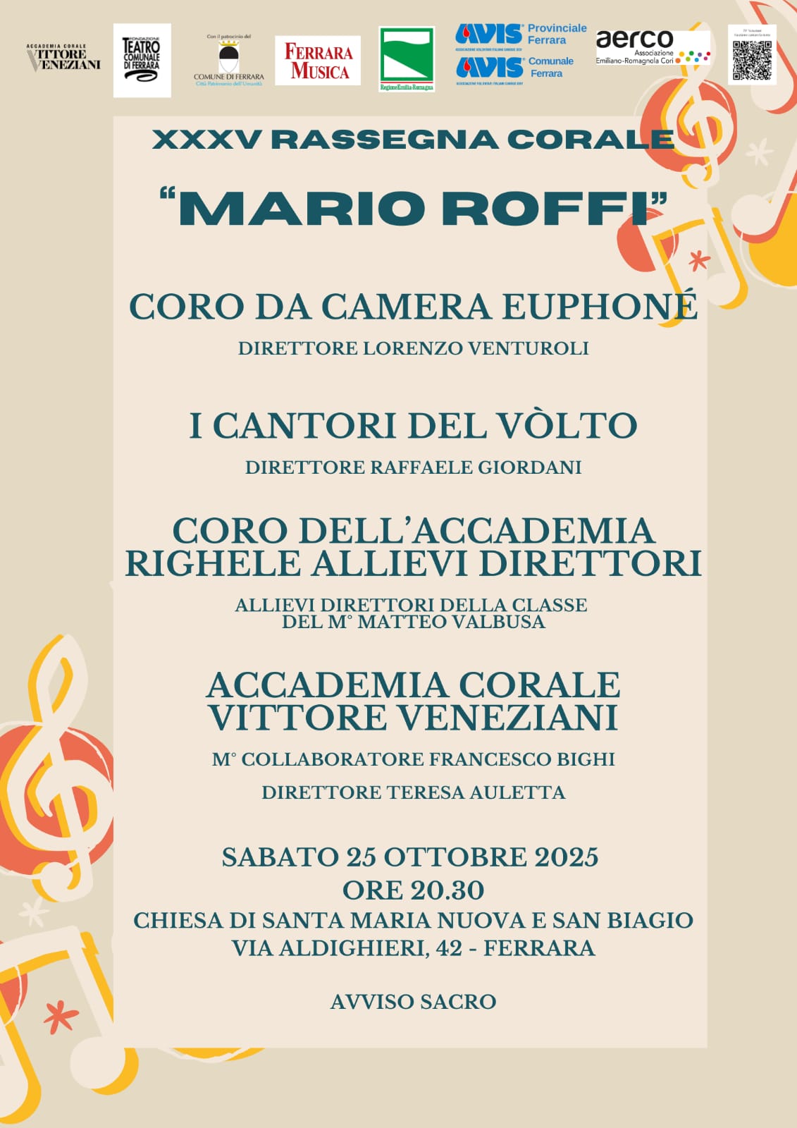 Sabato 25 ottobre 2025 alle 20:30 nella Chiesa di Santa Maria Nuova e (via Aldighieri 42, Ferrara) si terrà la Rassegna corale "Mario Roffi" che giunge quest'anno alla sua trentacinquesima edizione.