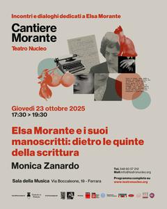 Giovedì 23 ottobre 2025 alle 17:30 alla Sala della Musica (Via Boccaleone 19, Ferrara), prosegue il ciclo di incontri "Cantiere Morante" alla scoperta dell'opera di una delle voci più radicali della letteratura italiana del Novecento. Il secondo appuntamento tratterà il tema "Elsa Morante e i suoi manoscritti: dietro le quinte della sua scrittura", a cura di Monica Zanardo docente di letteratura italiana all'Università degli Studi di Padova.