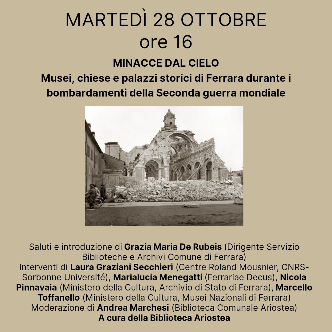 Avrà come tema "Minacce dal cielo. Musei, chiese e palazzi storici di Ferrara durante i bombardamenti della Seconda guerra mondiale" l'incontro di approfondimento in programma martedì 28 ottobre 2025 alle 16:00 nella sala Agnelli della biblioteca comunale Ariostea (via delle Scienze 17, Ferrara).