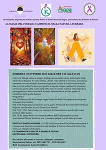 Una passeggiata a stretto contatto con la natura, per stare in compagnia e per assistere alla danza cromatica con cui la natura si prepara ogni anno al ritiro e ad una successiva nuova rinascita. Si chiama "La magia del foliage: camminata nella natura a Ferrara" ed è l'iniziativa che avrà luogo domenica 26 ottobre 2025, con ritrovo a partire dalle 9:00 alla Porta degli Angeli e partenza fissata alle 9:30, insieme alle guide ambientali escursionistiche. La manifestazione, che si sviluppa tra aggregazione e solidarietà, è promossa dall'Associazione Kairos e si avvale del patrocinio e del contributo dell'Assessorato alle Politiche Sociosanitarie del Comune di Ferrara.