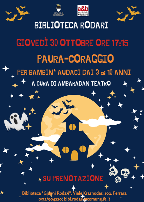 E' pensato per piccoli spettatori audaci lo spettacolo teatrale dal titolo "Paura-Coraggio" che giovedì 30 ottobre 2025 alle 17:15 andrà in scena alla biblioteca comunale G. Rodari (viale Krasnodar 102 a Ferrara). In attesa di Halloween, i bambini dai 3 ai 10 anni potranno assistere alla rappresentazione a cura di Ambaradan Teatro, per un pomeriggio dalle forti emozioni.