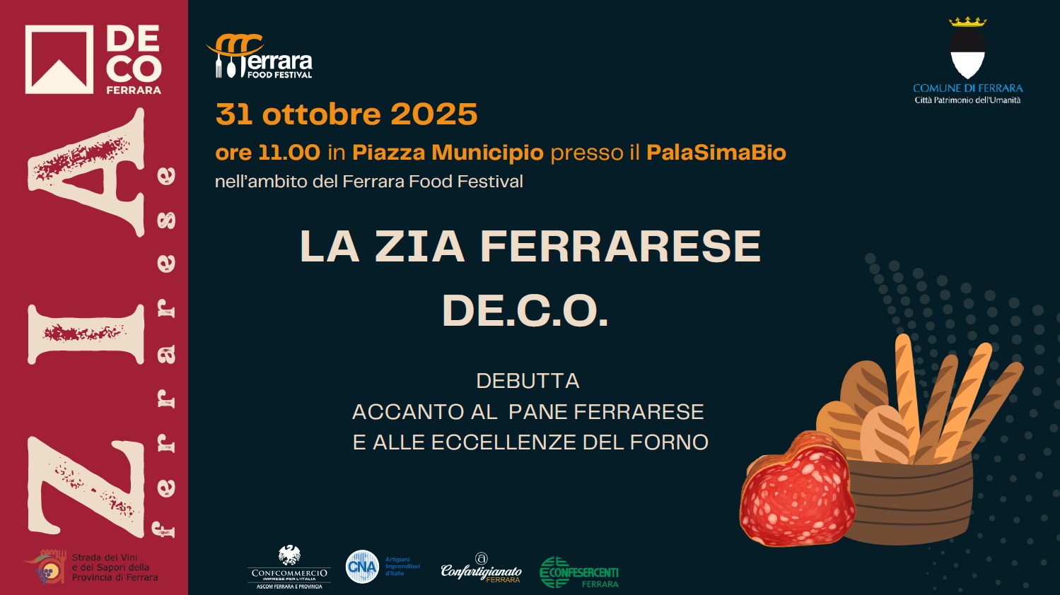 Il Comune di Ferrara in collaborazione con l'associazione provinciale Strada dei vini e dei sapori presenta il nuovo prodotto a marchio De.C.O, Zia Ferrarese, un'eccellenza gastronomica profondamente legata al territorio, simbolo di tradizione, autenticità e passione per i sapori locali. L'appuntamento sarà inoltre l'occasione per valorizzare il Pane Ferrarese e gli altri prodotti da forno del territorio, con testimonianze dirette dei produttori e degustazioni che metteranno in luce la qualità e l'unicità di uno dei prodotti più rappresentativi della tradizione locale. L'evento è realizzato in collaborazione con ASCOM, CNA, Confartigianato e Confesercenti, nell'ambito del progetto Regionale "Sapore di Pane: fresco, sano, artigiano". Durante l'incontro si svolgeranno dimostrazioni e degustazioni a cura dei produttori locali e degli studenti dell'Istituto Orio Vergani.