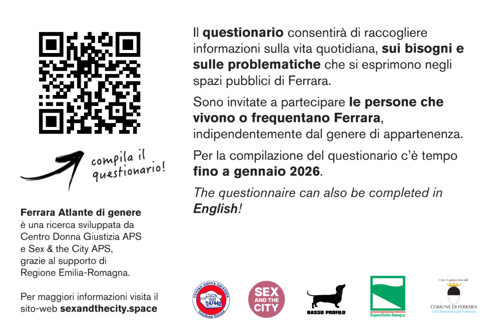 Venerdì 31 ottobre 2025 alle 18:00 al Consorzio Wunderkammer (via Darsena 57, Ferrara), sarà presentato l'avvio di un ambizioso progetto di ricerca, analisi e azione denominato "Ferrara Atlante di genere", di cui è soggetto capofila il Centro Donna Giustizia Aps di Ferrara. Il progetto è co-finanziato dalla Regione Emilia Romagna sulla base del bando regionale delle Pari opportunità (L.R. n. 6/2014), con la collaborazione dell'Associazione Sex&theCity, Basso Profilo, e partner istituzionali tra cui i Comuni di Ferrara, Codigoro e Comacchio.