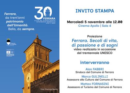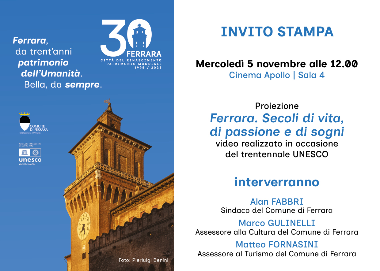 Mercoledì 5 novembre 2025 alle 12:00, nella sala 4 del Cinema Apollo (via del Carbone 35, Ferrara), si terrà la conferenza stampa di presentazione del video "Ferrara. Secoli di vita, di passione e di sogni", realizzato dal Comune di Ferrara in occasione del trentennale del riconoscimento Unesco.