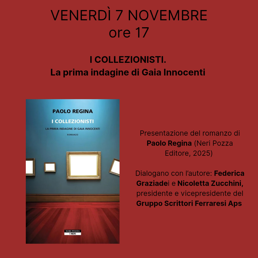 E' la storia di una donna vicequestore dalla doppia vita, quella raccontata da Paolo Regina nel romanzo dal titolo "I collezionisti. La prima indagine di Gaia Innocenti" che venerdì 7 novembre 2025 alle 17:00 sarà presentato nella sala Agnelli della biblioteca comunale Ariostea (via delle Scienze 17, Ferrara).