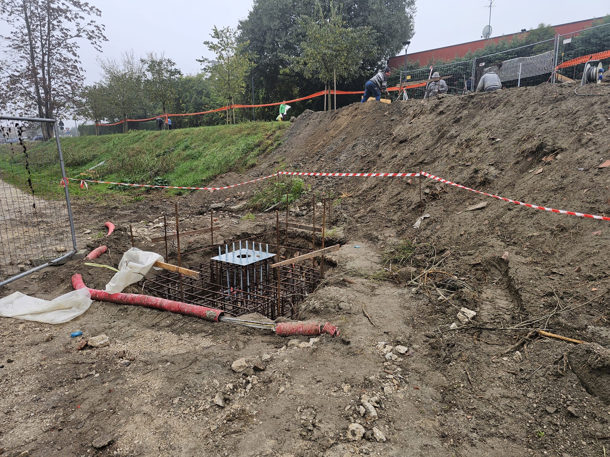 Nelle foto - scaricabili in fondo alla pagina - alcune immagini delle prove di carico dei pali e preparazione dei plinti di fondazione e del rendering del progetto