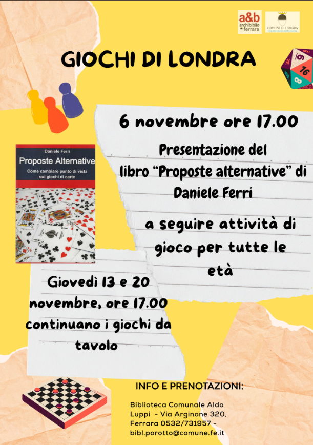 E' fissato per giovedì 20 novembre 2025 alle 17:00 il terzo appuntamento dedicato ai giochi da tavolo, insieme a Daniele Ferri, alla biblioteca comunale Luppi, di via Arginone 320 (Porotto - Ferrara).