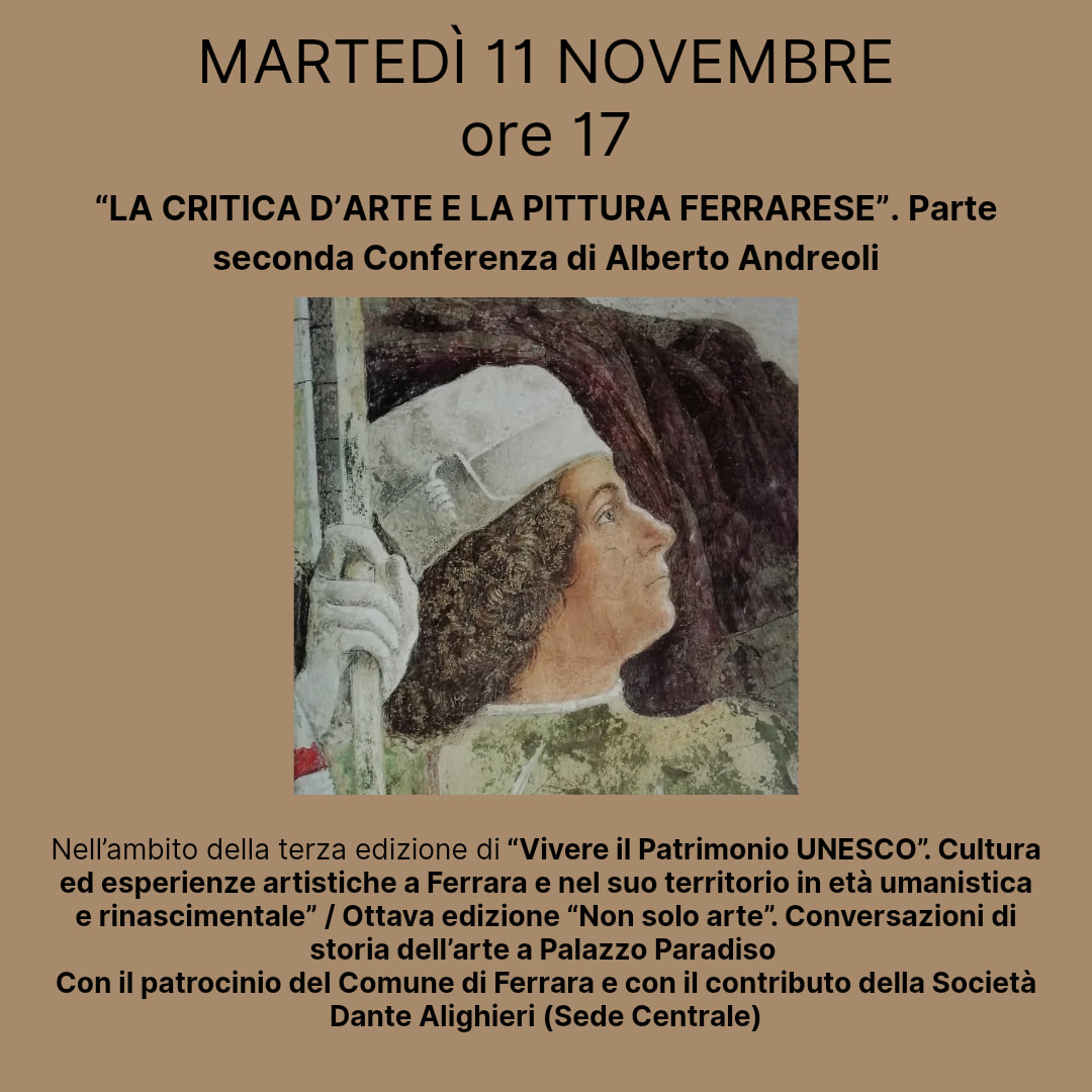 L'appuntamento rientra nell'ambito della terza edizione di "Vivere il Patrimonio UNESCO. Cultura ed esperienze artistiche a Ferrara e nel suo territorio in età umanistica e rinascimentale" e dell'ottava edizione di "Non solo arte. Conversazioni di storia dell'arte a Palazzo Paradiso".