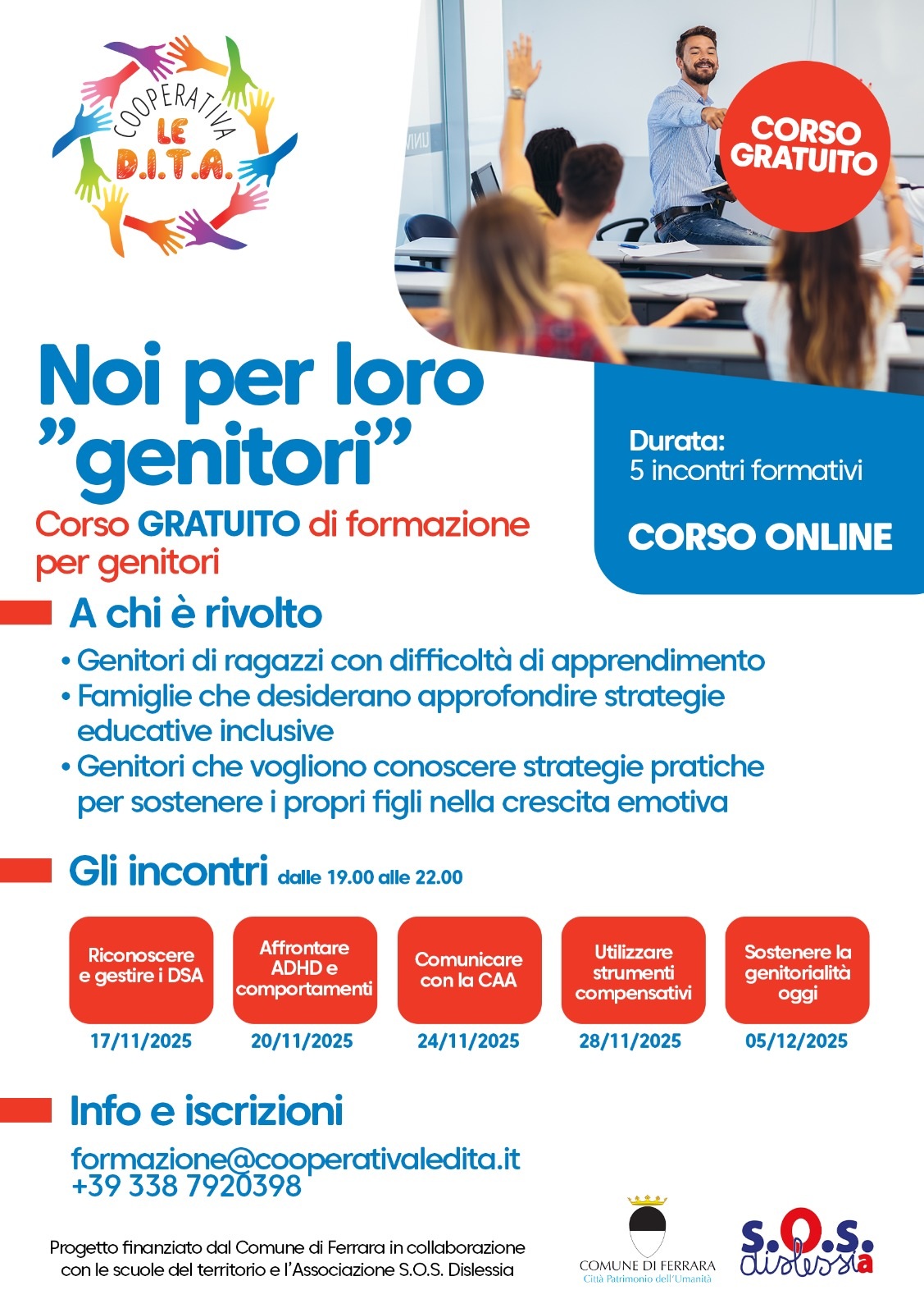 Conoscere per costruire una società più inclusiva. È questo il principio alla base di "Noi per loro genitori", il nuovo corso di formazione gratuito rivolto ai genitori di ragazzi con difficoltà d'apprendimento, promosso dalla Cooperativa Le Dita, in collaborazione con Sos Dislessia, che partirà lunedì 17 novembre 2025, con cinque incontri online, fino al 5 dicembre 2025.