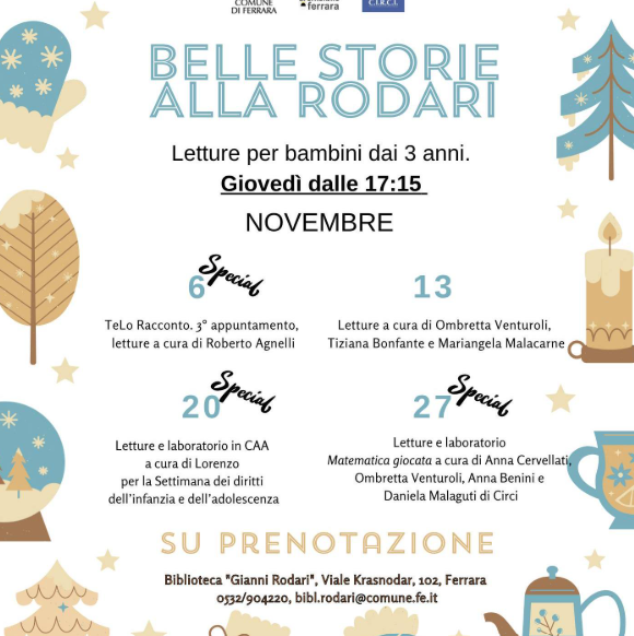 Tornano alla biblioteca comunale Rodari di Ferrara (viale Krasnodar 102) le "Belle Storie" a cura delle lettrici volontarie dlel'associazione Circi. Il nuovo appuntamento è per giovedì 13 novembre 2025 alle 17:15, per bambine e bambini dai 3 anni, con Ombretta Venturoli, Tiziana Bonfante e Mariangela Malacarne che proporranno tante letture divertenti e coinvolgenti, per un pomeriggio d'autunno da trascorrere in compagnia.
