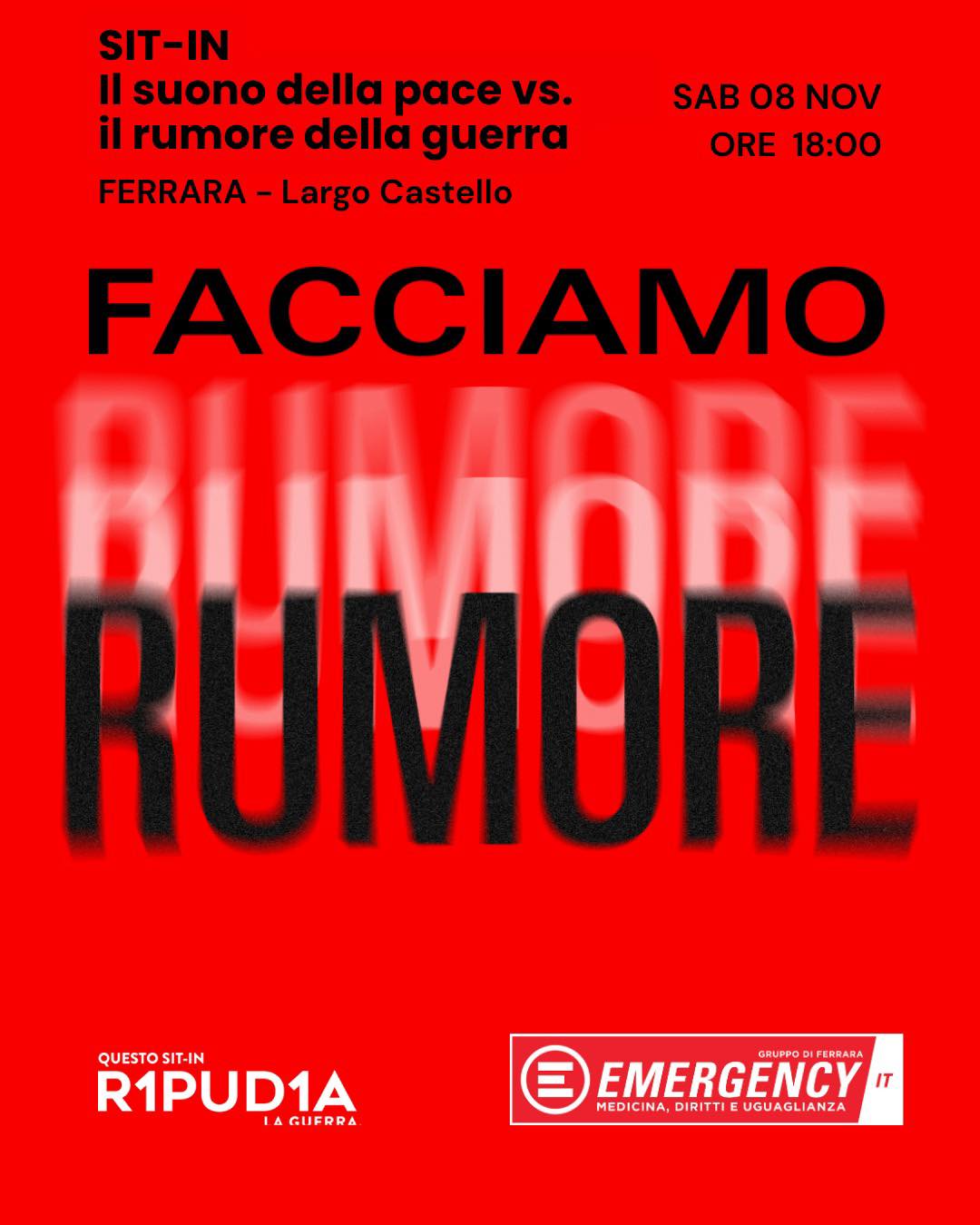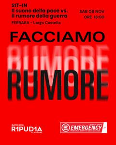 Emergency Ferrara ha organizzato per sabato 8 novembre 2025 alle 18 in Largo Castello una manifestazione pubblica dal titolo "Facciamo Rumore" contro le guerre nel mondo. L'iniziativa è inserita nella campagna nazionale ‘Ripudia' che in questi giorni riempirà le piazze di tutta Italia con manifestazioni analoghe. Nell'occasione vi sarà la lettura dell'articolo 11 della Costituzione cui seguiranno seguiranno poi 5 minuti di rumore collettivo e momenti di riflessione.